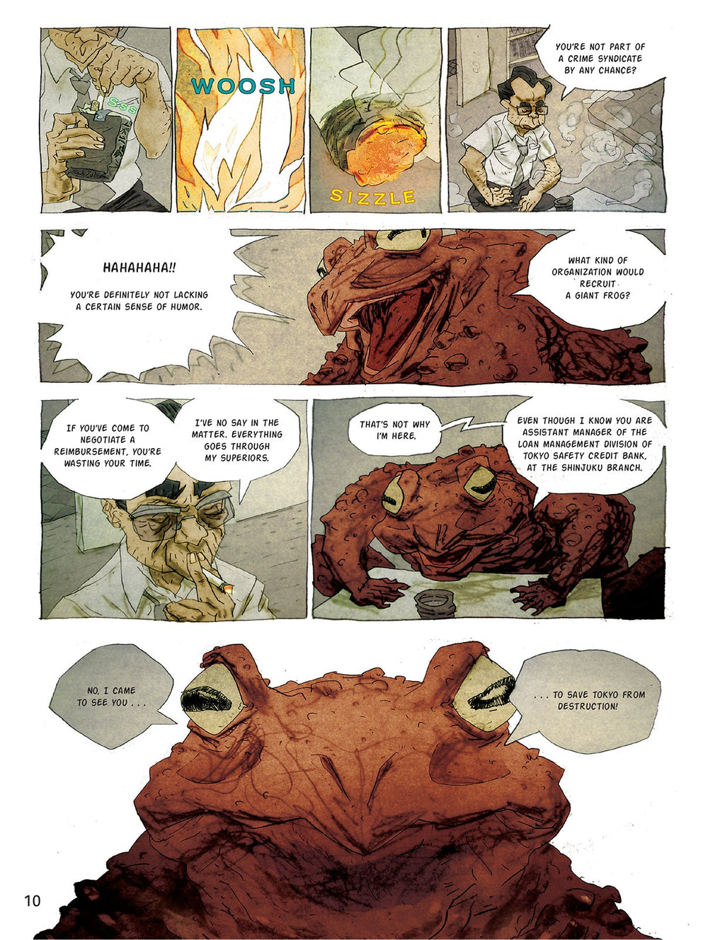 Super-Frog Saves Tokyo: A few days after an earthquake, Katagiri discovers a giant frog in this home. The frog promises to save Tokyo from another earthquake, but Katagiri must help him. Is this real, or is Katagiri dreaming? "[This story has] such an engaging mix of realism and fantasy that it takes a while for you to realize what a sad undertow the story has and how much it says about Katagiri's solitary life, his feelings of powerlessness and his dread of another quake." --The New York Times