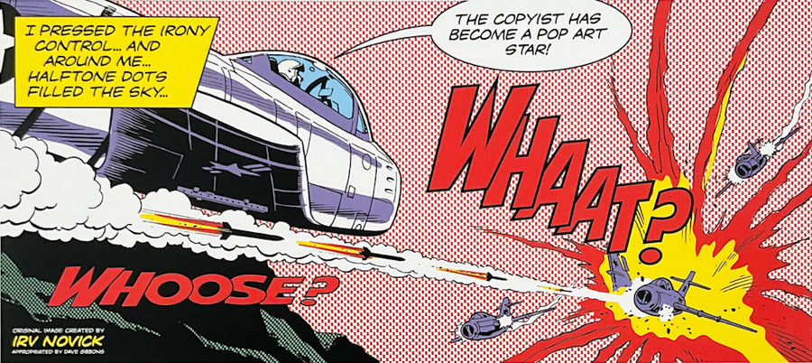 It 's high time comics creators themselves re-appropriated Roy 's original sources and turned the spotlight back onto the brilliant, unsung illustrators who originated them. In that spirit, Dave Gibbons has responded to Sooke 's art-criticism that Lichtenstein 's re-mix was "more successful" than Novick 's original composition by making 'WHAAT? ', his own appropriation of the panel and replacing none of Novick 's original elements (above). Gibbons has also stayed true to the full original script in both caption and balloon, probably written by editor Robert Kanigher, and to the design and placement of letterer Gaspar Saladino 's lettering and sound effects. Gibbons wittily turns WHAAM! ' into WHAAT? ' and the missing onomatopoeia of the missile firing, WHOOSH! ', into the telling question, WHOOSE? '. WHAAT? ' even at this scale proves that there is every bit as much graphic power and compositional artistry in the source material. And do enlarge this masterpiece further and you 'll discover the real secret behind those red Benday dots.