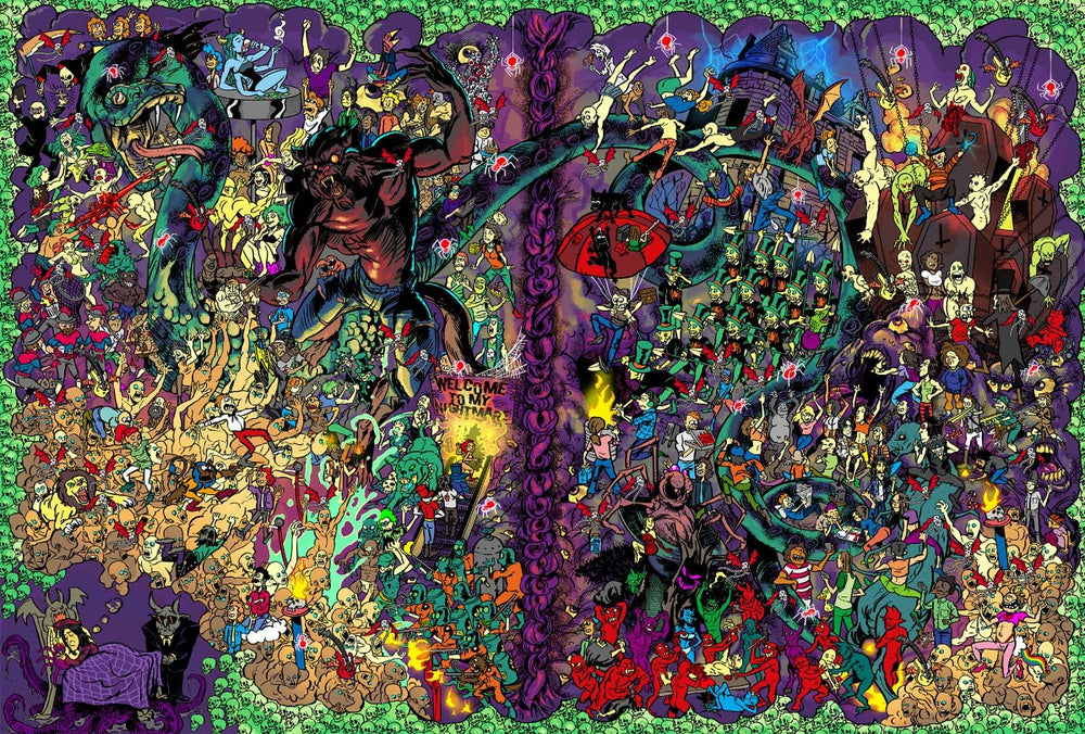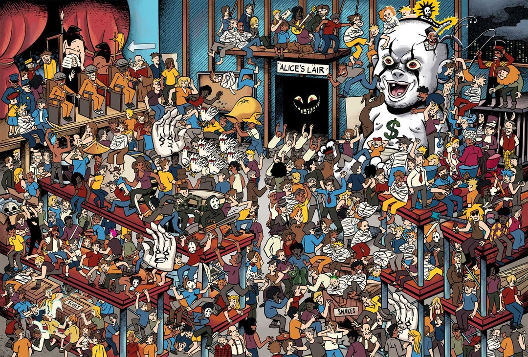 Can you find Alice Cooper? Search for the famous frontman amid elaborately illustrated scenes that depict the madness and mayhem of the musician's legendary avant-garde aesthetic.