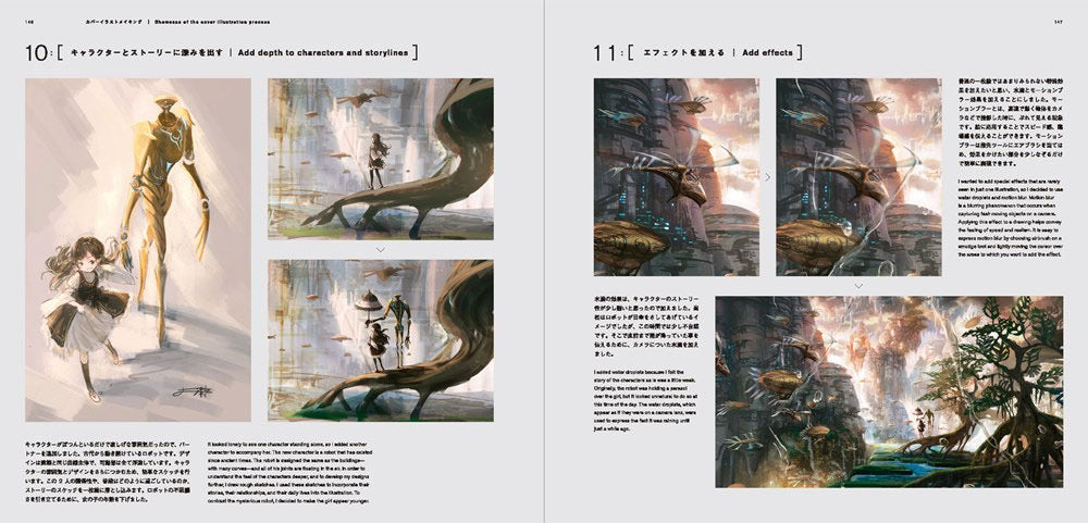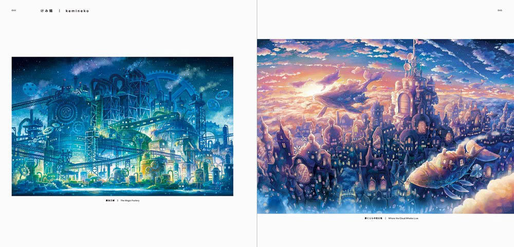This is the second title in the Everyday Scenes from Parallel Worlds series. It showcases background artworks featuring fantasy worlds: celestial castles, pirate ships sailing through the clouds, retro-futuristic inventions, deserted architectural spaces, towns that have sunk under the ocean, an enchanted forest and a space locomotive that runs in neo-futuristic world. Featuring only a few anthro angels, dragons and other imaginary animals, attention is focused primarily on the beauty of the illustrated backgrounds.