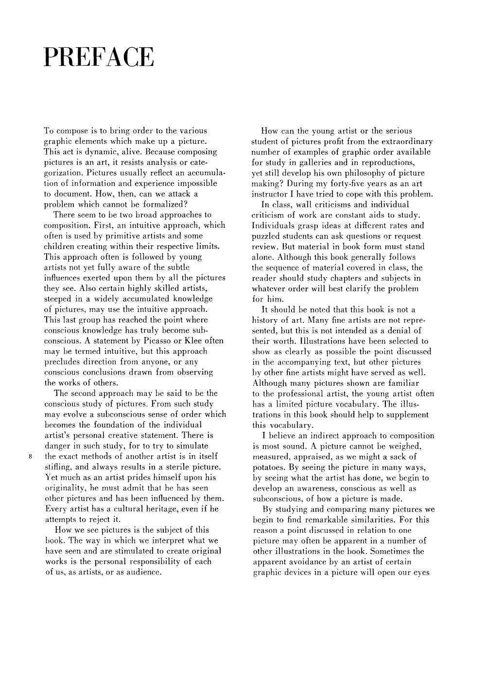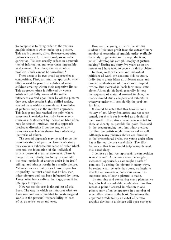 A picture cannot be weighed, measured, and appraised like a sack of potatoes. Composing Pictures avoids the "discussion by dissection" method of picture analysis, stressing instead the graphic forces that remain valid and essential regardless of how art forms and fashions may change.