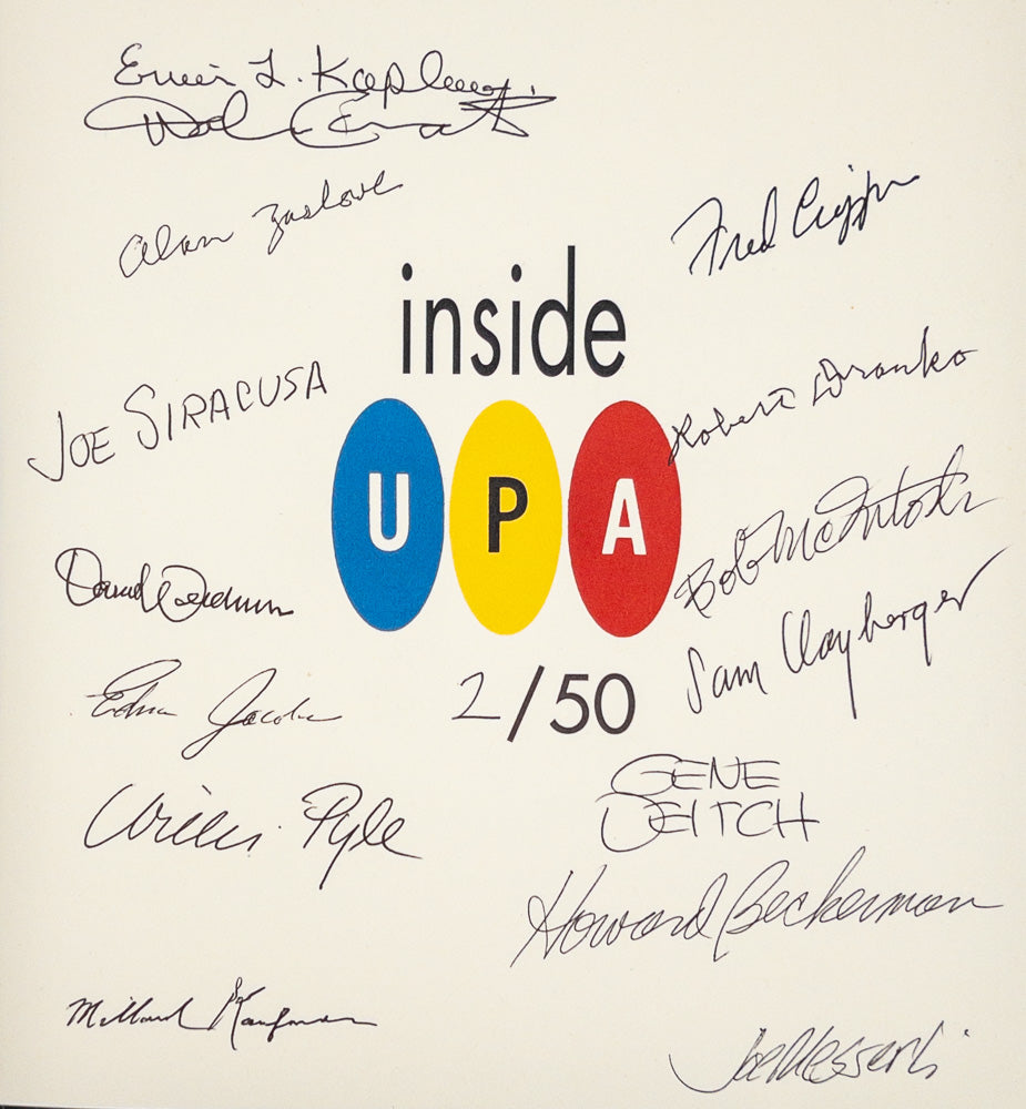 #2 of 50 numbered copies signed by fifteen UPA artists: Howard Beckerman, Fred Crippen, Gene Deitch, Edna Jacobs, Dolores Canata, Sam Clayberger, Robert Dranko, Ervin Kaplan, Millard Kaufman, Bob McIntosh, Joe Messerli, Willis Pyle, Joe Siracusa, David Weidman, and Alan Zaslove.