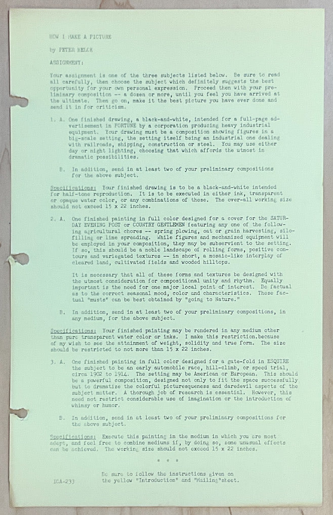 This volume is Peter Helck's contribution to the Famous Artists School's Advanced Program. An entire course (7 lessons in 136 pages) written & illustrated by Helck.