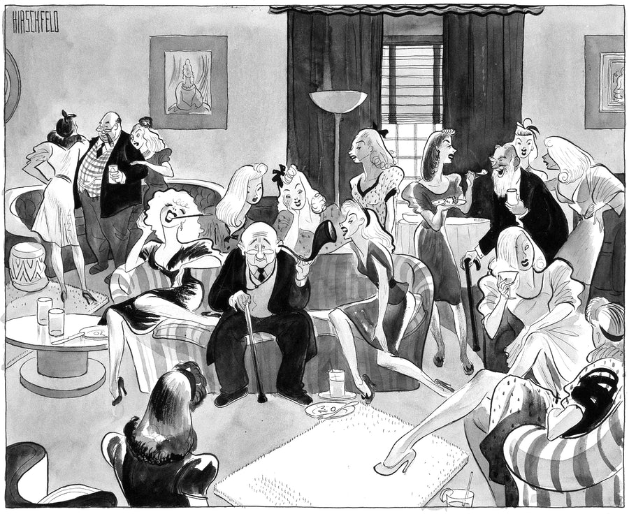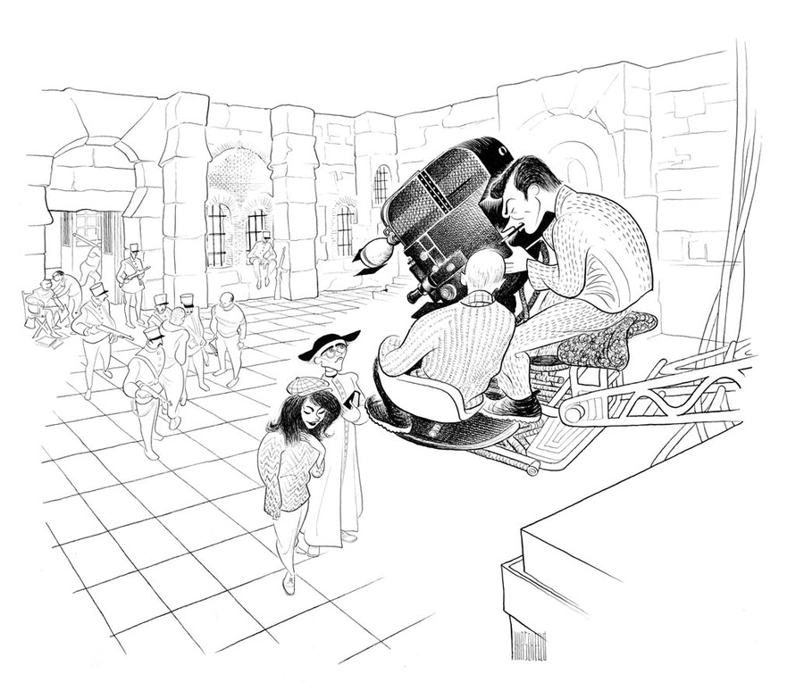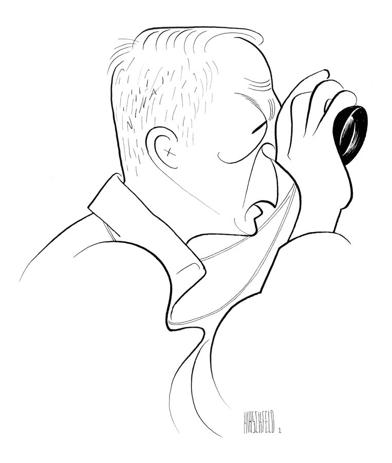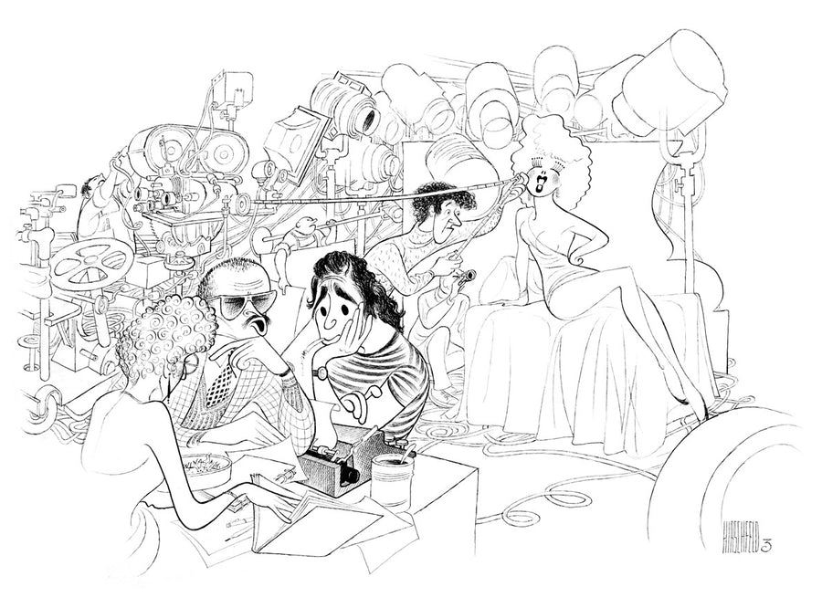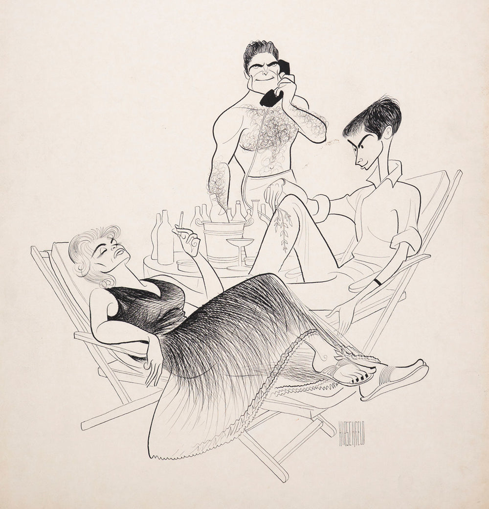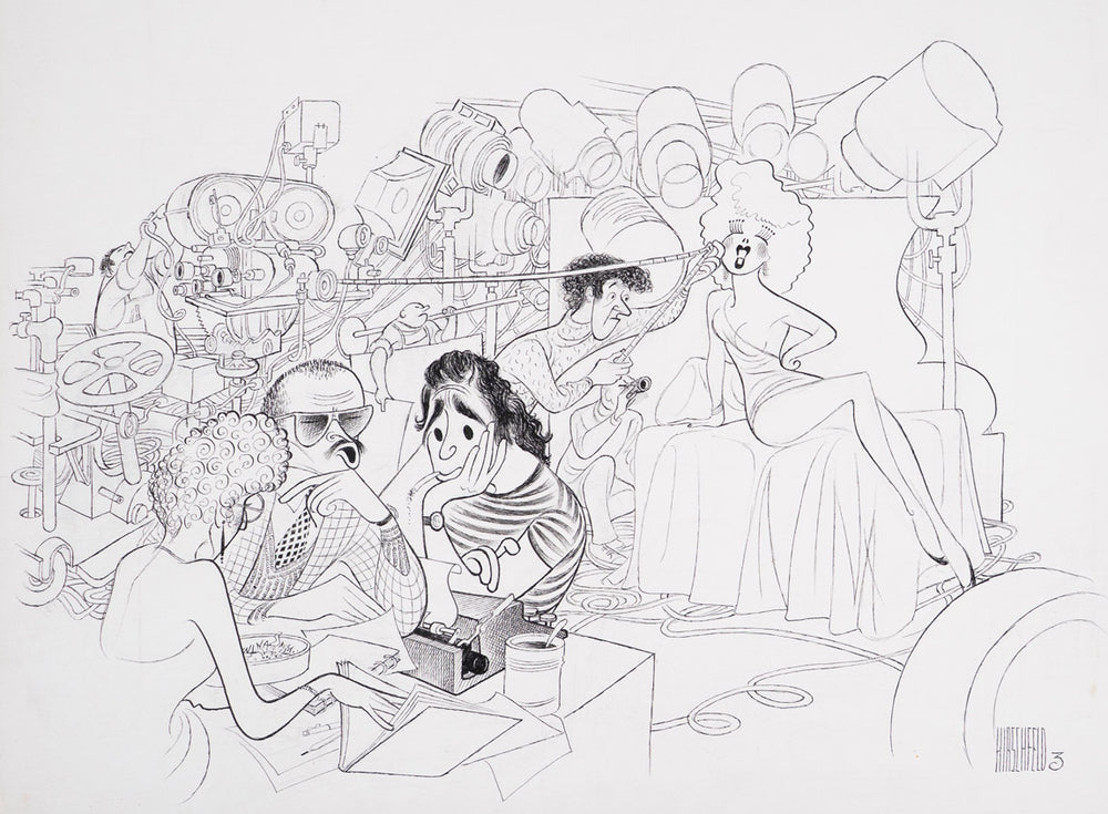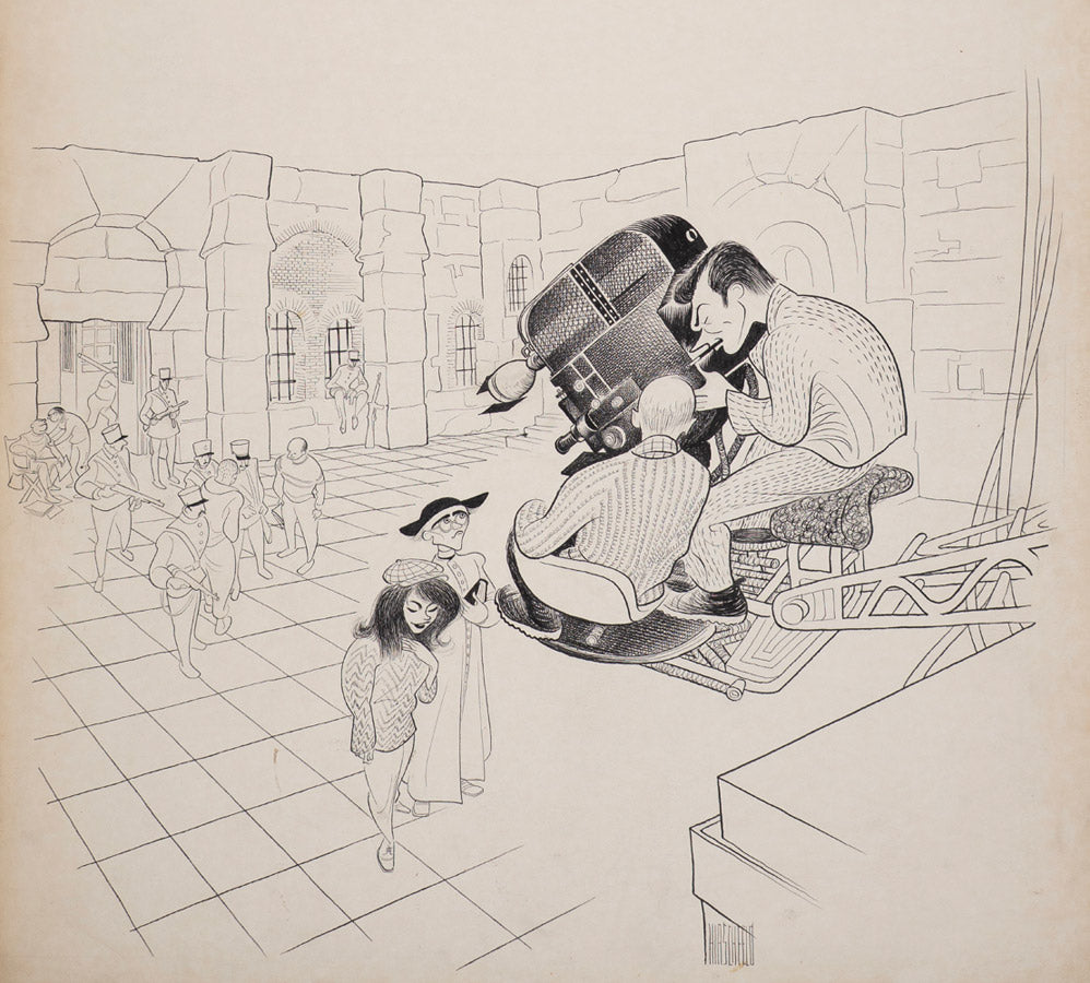 Hirschfeld also made frequent excursions to Hollywood at the behest of the movie studios. They knew that certain newspapers and periodicals would run a Hirschfeld illustration regardless of the subject matter. It was also a matter of prestige to be drawn by Hirschfeld. Once again, he was visiting the sets and soundstages, not viewing a cut of the film.