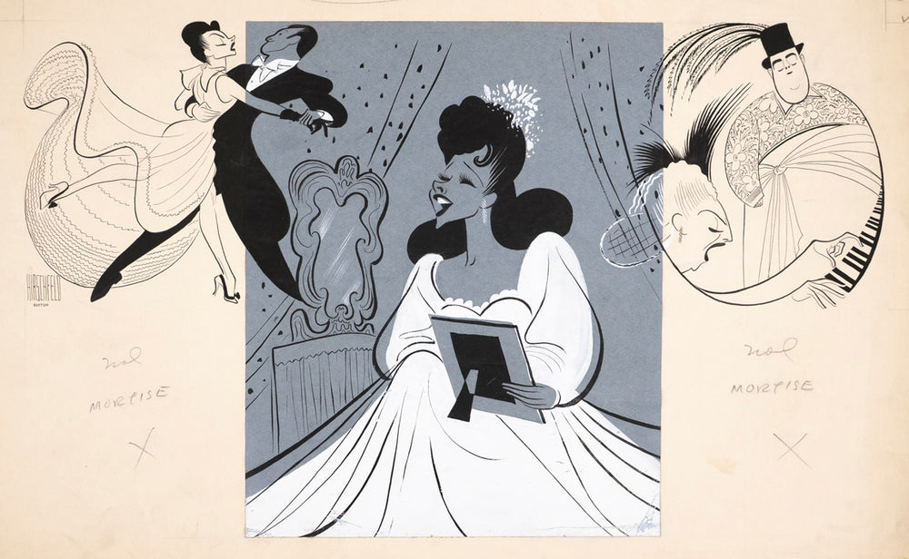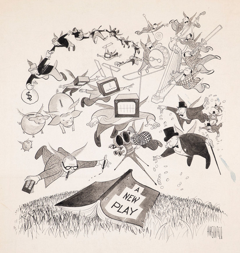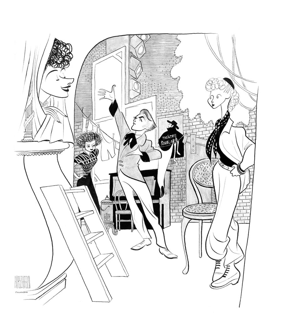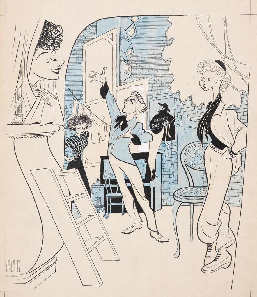This exhibition of Hirschfeld originals features illustrations of Broadway and Hollywood behind the scenes: stages, sets, auditions, rehearsals, and the offstage, offscreen players as well as the actors and actresses on the marquees.