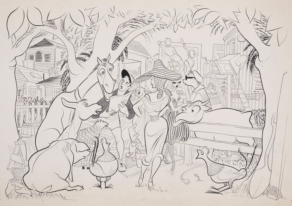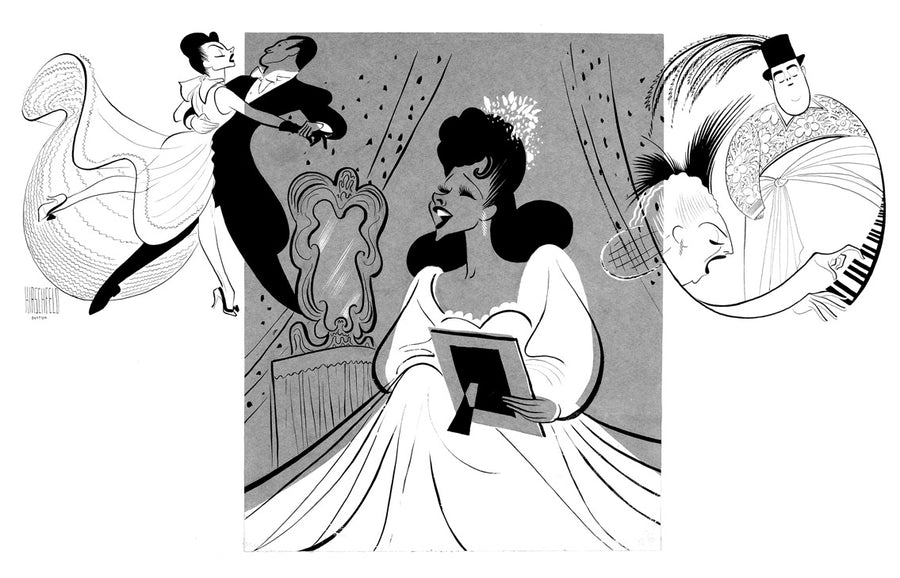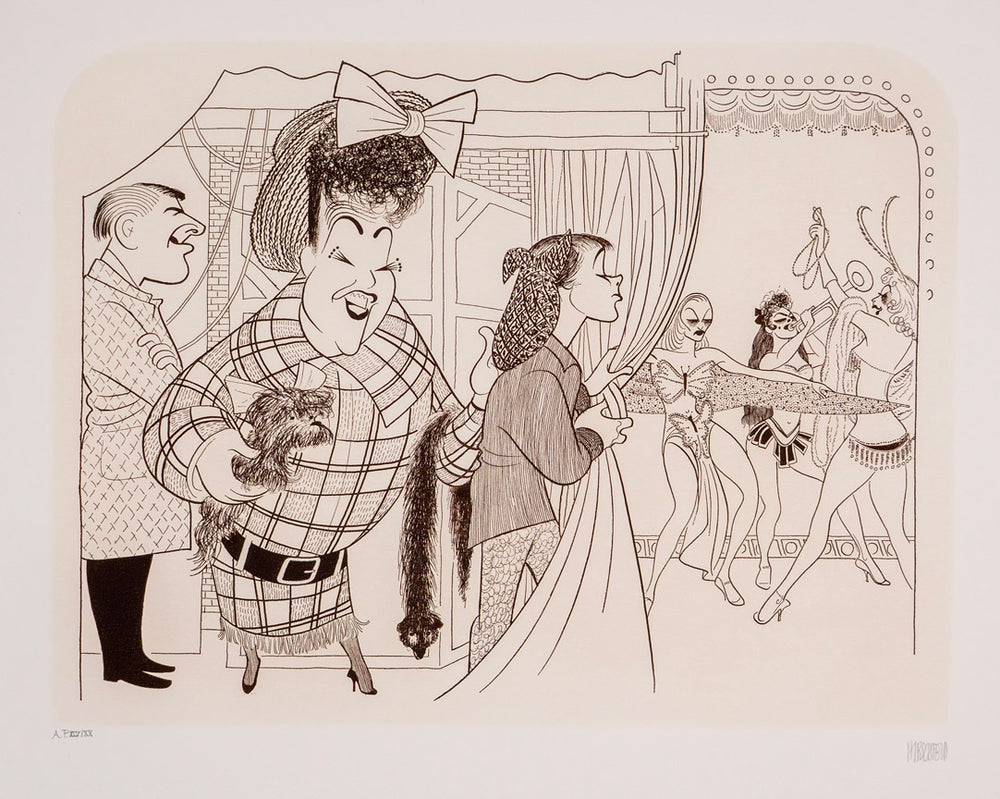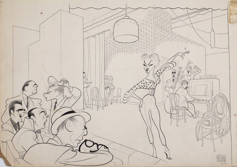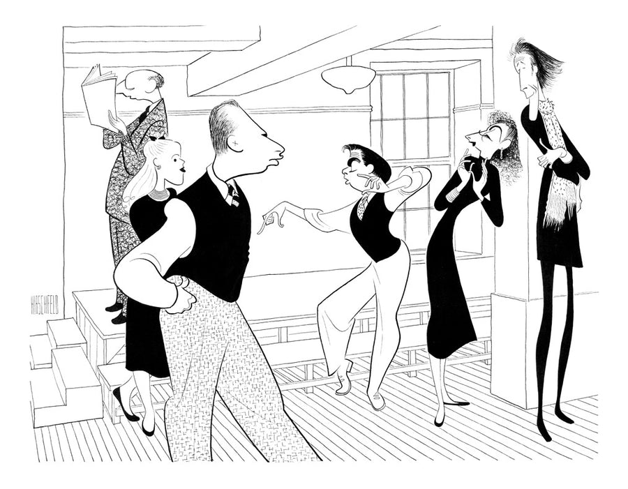 This exhibition of Hirschfeld originals features illustrations of Broadway and Hollywood behind the scenes: stages, sets, auditions, rehearsals, and the offstage, offscreen players as well as the actors and actresses on the marquees.