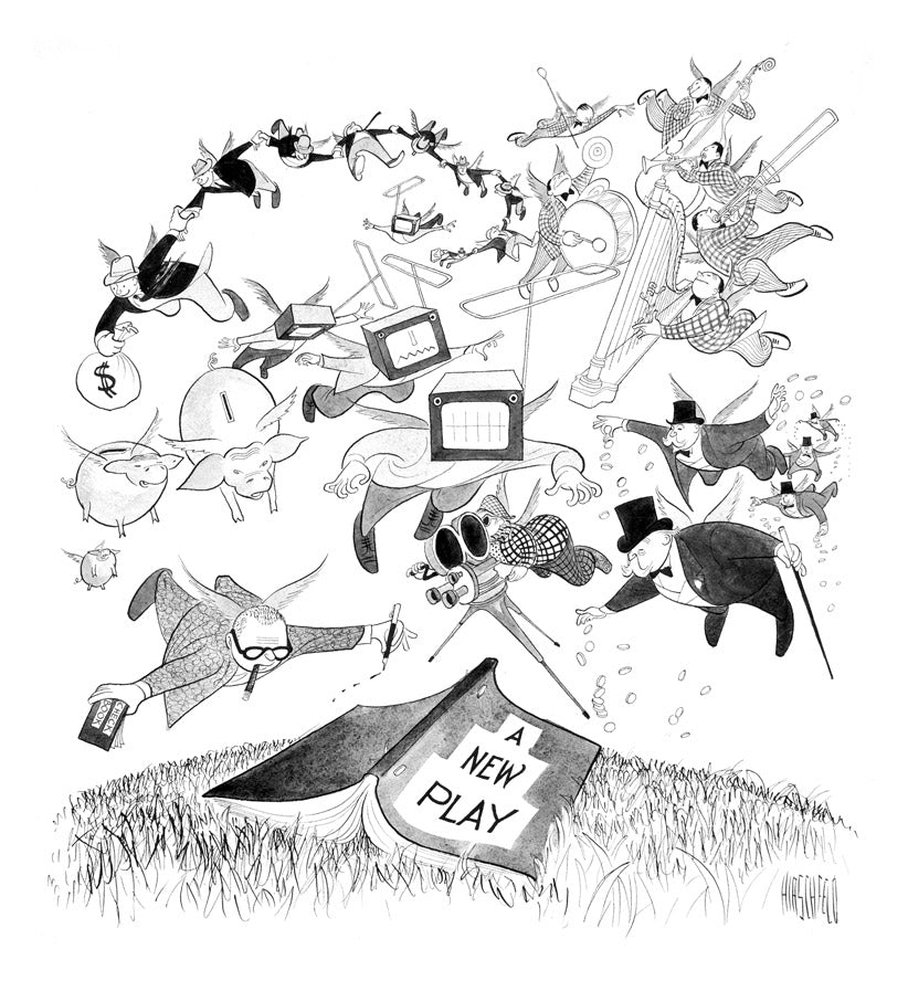 Broadway was Hirschfeld's beat. And it’s clear from all of his work that he loved it. The flops just as much as the hits. For his illustrations to be timely, he often started the illustration before the reviews came out. He saw the plays in rehearsals and tryouts, when the sets were being built and the whole production was still full of potential.