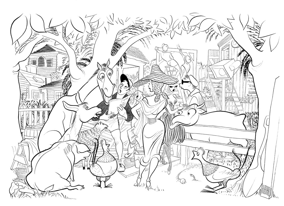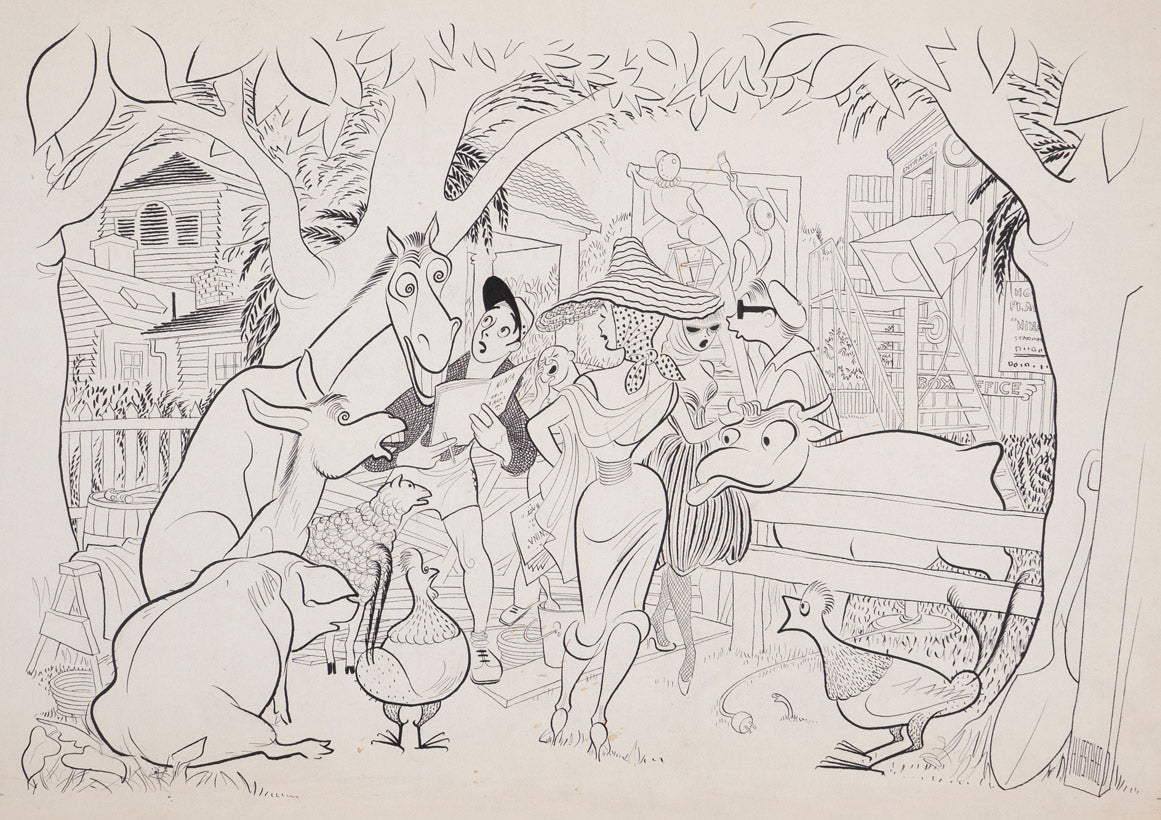 For animal lovers, Hirschfeld playfully depicts all the barnyard regulars in this evocation of summer stock theater.