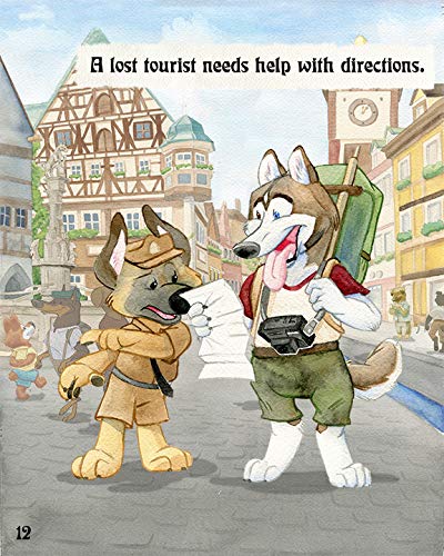 An illustrated children's book featuring a day in the life of Officer Voof, a German Shepherd police dog in a small town in Germany.