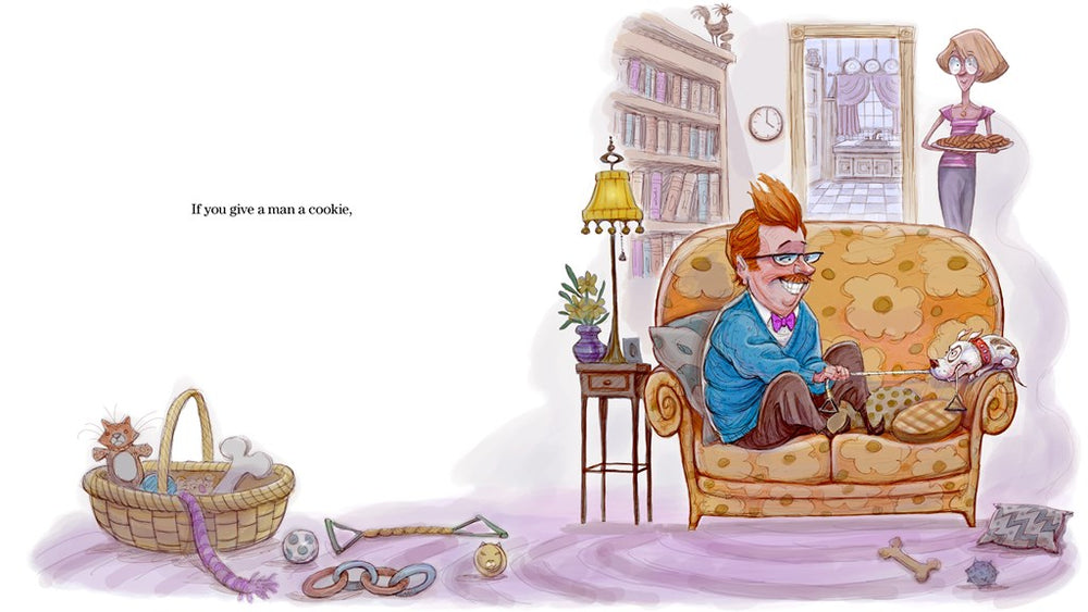 If You Give a Man a Cookie is a woman's commentary about her helpless man and the chain of events that leads him on a journey from the bed to the bathroom to the couch and back to bed at nightfall.