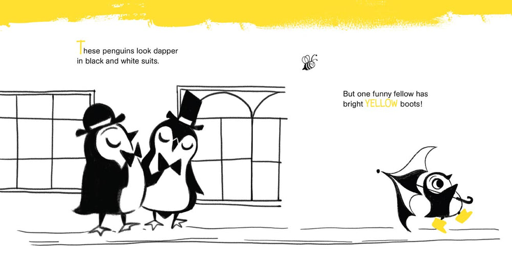 Have you ever seen a zebra wearing pink polka dots? Or a penguin with bright-yellow boots? Can you spot all the colors on these silly animals that aren't quite black and white?