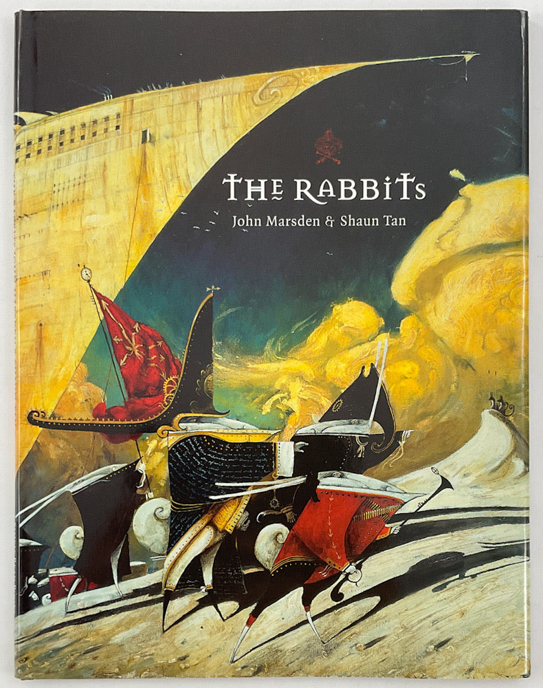 The Rabbits, written by Australian author John Marsden, is a fable about colonisation, told from the viewpoint of the colonised. An unseen narrator describes the coming of 'rabbits' in the most minimal detail, an encounter that is at first friendly and curious, but later darkens as it becomes apparent that the visitors are invaders. The style of the book is deliberately sparse and strange, with both text and image conveying an overall sense of bewilderment and anxiety as native numbat-like creatures witness environmental devastation under the wheels of a strange new culture.