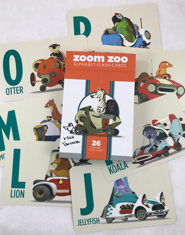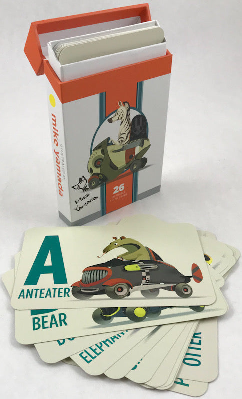From concept artist Mike Yamada, a set of 26 full-color alphabet flash cards each with a different animal in a unique car. Plus an artist's bio card and a blank card.
