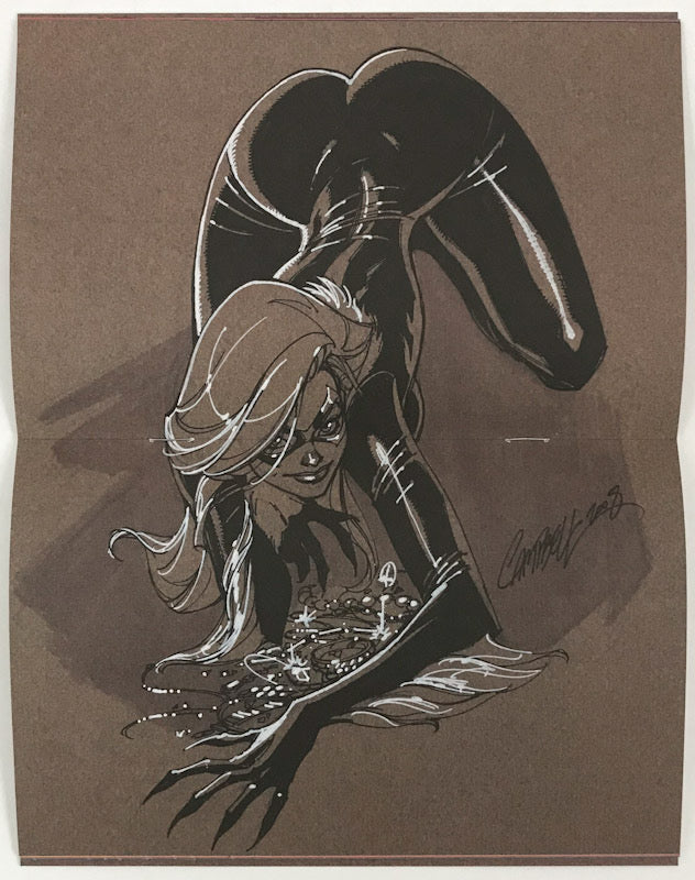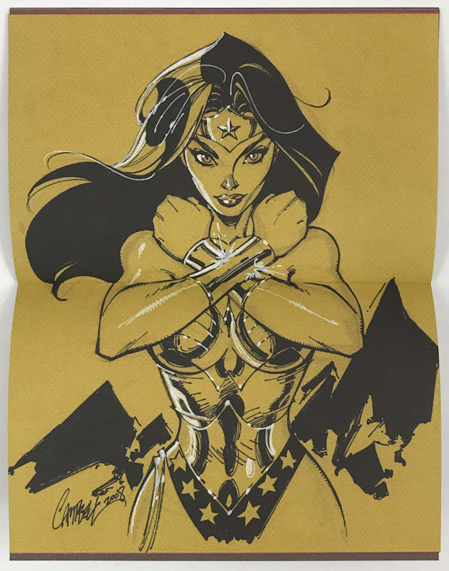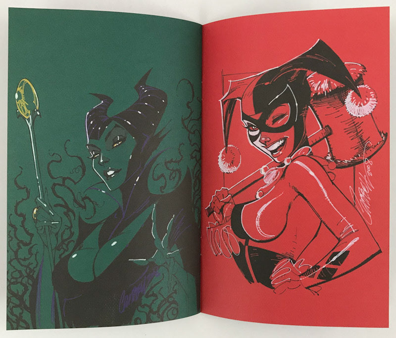 With this 2008 convention sketchbook, Jeff created a suite of 24 finished black ink drawings on middle-tone colored paper with highlights in white ink and sometimes another accent color added. These were all new and original to this book and never before published. Red Sonja, Danger Girl, Jessica Rabbit, the Creature from the Black Lagoon, Zatanna, Captain America, Spider-Man, Mary Jane, Hellboy, Wonder Woman, Maleficent, Witchblade, Wolverine, Smurfette, and others.