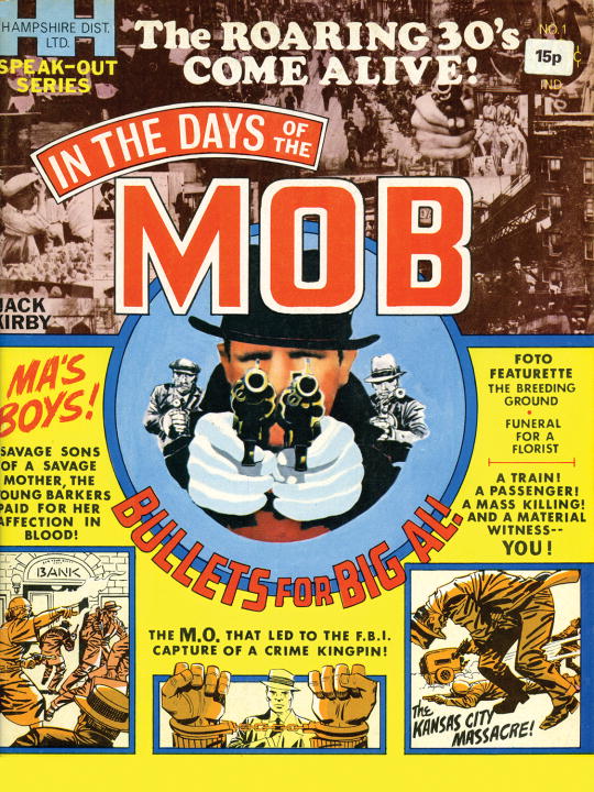 In the Days of the Mob #1 features crime stories from the Roaring 30s: "Welcome to Hell," "Ma's Boys," "Bullets for Big Al," "Kansas City Massacre," and "Method of Operation." All stories and pencils by Jack Kirby, inks by Vince Colletta. Two pages of cartoons by Sergio Aragones. And a two-page text story, "Funeral for a Florist," by Mark Evanier and Steve Sherman.
