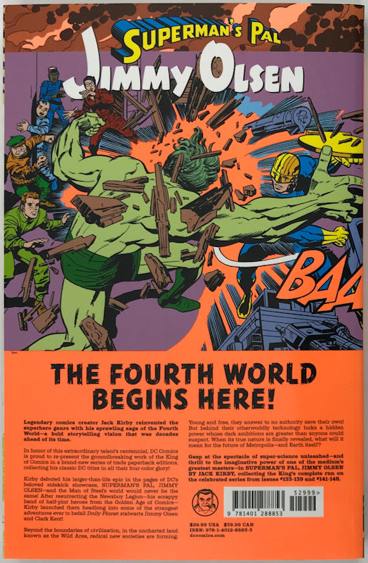 Jack Kirby's legendary take on Superman's best friend, Jimmy Olsen, is now collected in its entirety for the first time ever, with this graphic novel that features stories introducing some of the most memorable DC characters ever, including Darkseid! Follow the adventures of Superman's best pal, Jimmy Olsen! Featuring Jimmy in his own adventures and also featuring the Man of Steel himself, this phenomenal series introduced characters such as Darkseid, Mister Miracle and Orion! Writer and illustrator Jack Kirby used this book as a platform by which to launch his Fourth World creations, leaving a handprint on the DC Universe for years to come!