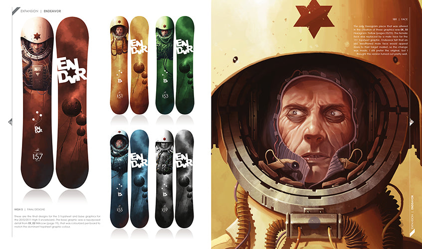 This book will feature a gallery section of artwork, a chapter on the artwork created for use as graphics on snowboards, the snowboards and the corresponding marketing material as well as a chapter on the creation of a resin model kit by Industria Mechanika.