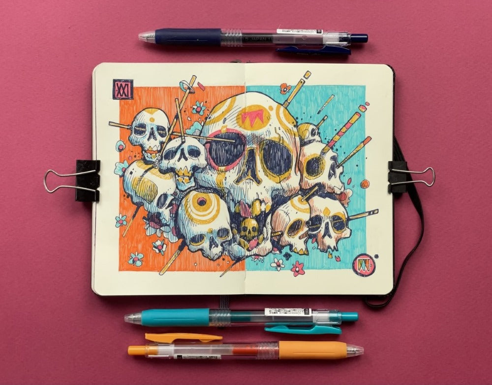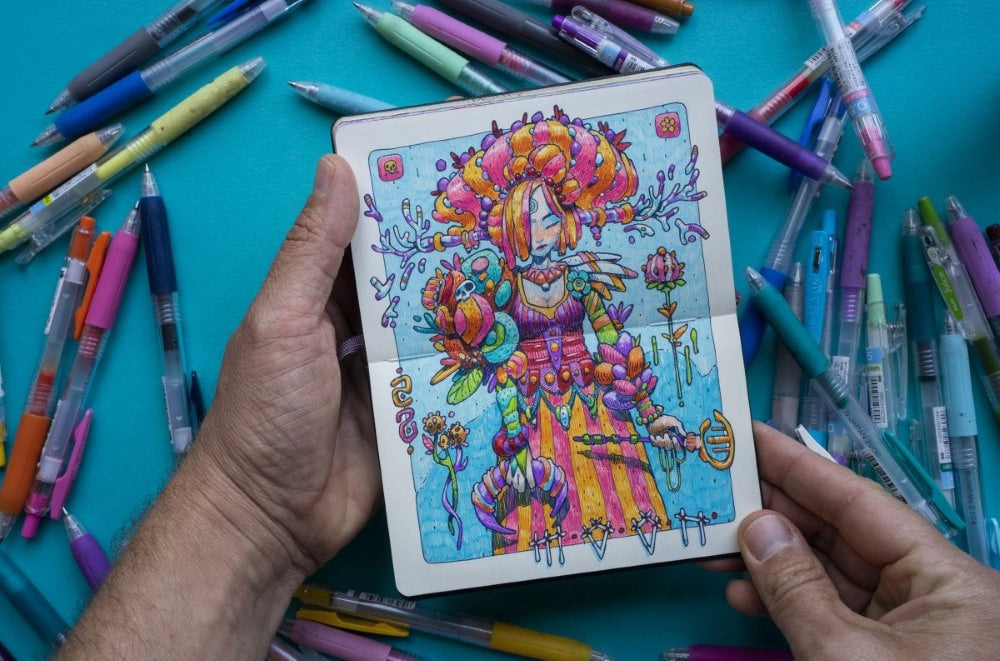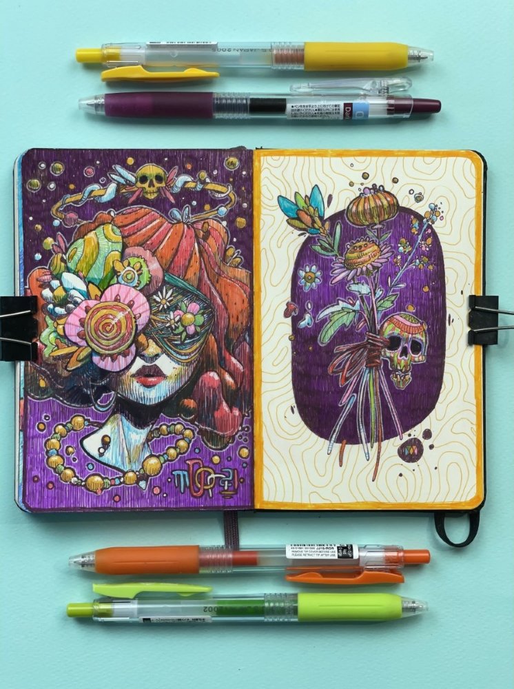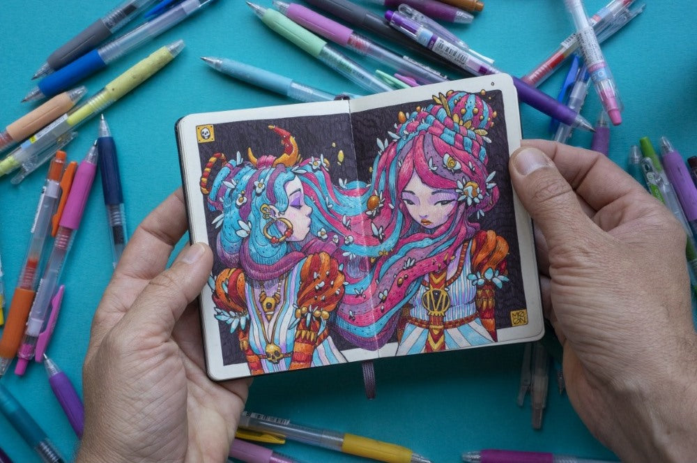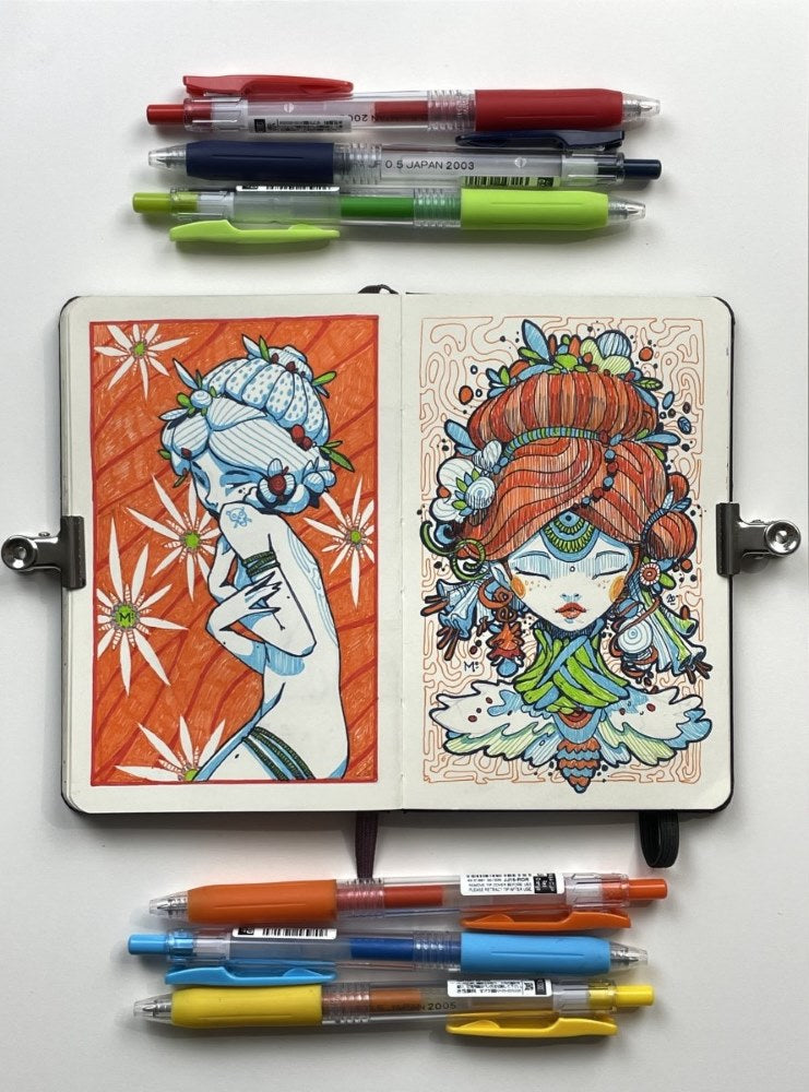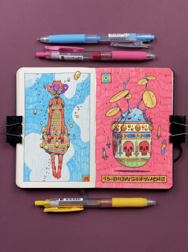 Drizzle is Moon's collection of drawings done with 0.5mm gel pens in two small notebooks (9 x 14 cm - 3.5x5.5") over the past two years. After posting many of them on social media, it was decided to give them permanent life in this book so that they don't die in limbo on the internet!