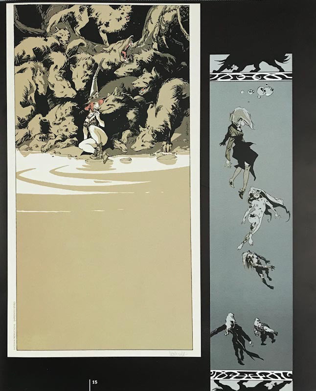 The book includes rare early comic book work, numerous illustrations for ex-libris, books, and periodicals; poster and print work; work for games (Alone in the Dark, Meta-Barons, Shaan); character and creature designs for animation (Ozma of Oz, Warner Bros., Excalibur, Les Enfants du Feu, Thorgal); and video games; animal drawings; artwork from her exhibition in Los Angeles; studies for her Aphrodite illustrations; and more.