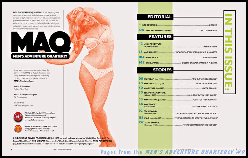 The MEN'S ADVENTURE QUARTERLY #9 features classic crocodile and alligator attack stories from men's adventure magazines, an article about killer croc and gator films by movie maven John Harrison, an article about MAMs published in the land of Crocodile Dundee by Australian pulp culture historian Andrew Nette, another outstanding layout by MAQ co-editor Bill Cunningham, and lots more cool stuff.