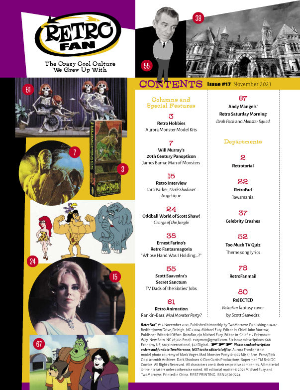 Plus: Rankin-Bass' Mad Monster Party, Aurora Monster model kits, a chat with Aurora painter James Bama, George of the Jungle, The Haunting, Jawsmania, Drak Pack, TV dads' jobs, and more fun, fab features!