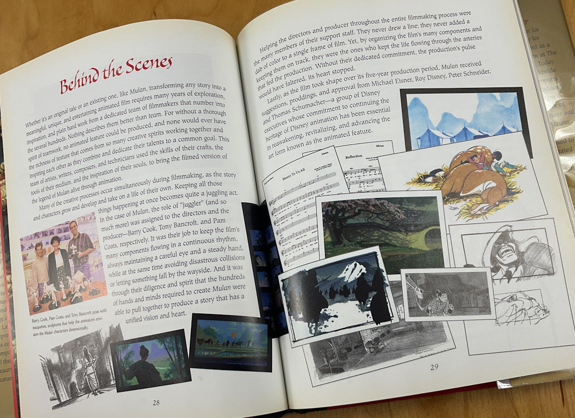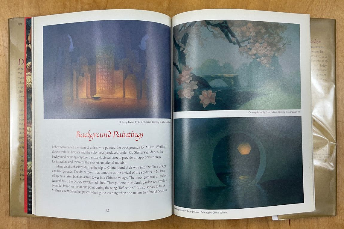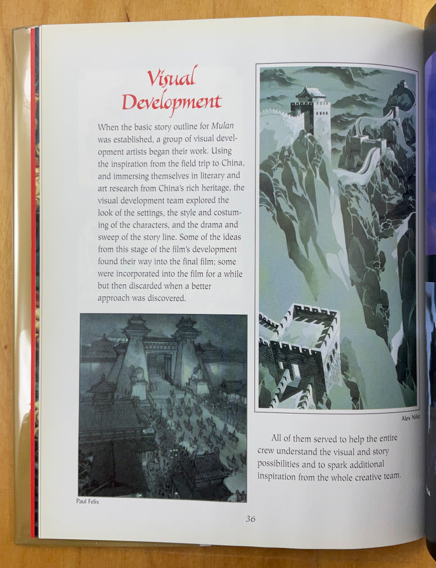 A slim but profusely illustrated making of book and storybook. This book contains over 100 character and background designs, storyboards, and layouts created by Disney artists during the production of Mulan. Conceptual art by Peter De Seve, Caroline Hu, Alex Nino, Pres Romanillo, Chris Sanders, others; storyboards; animation drawings by Mark Henn.
