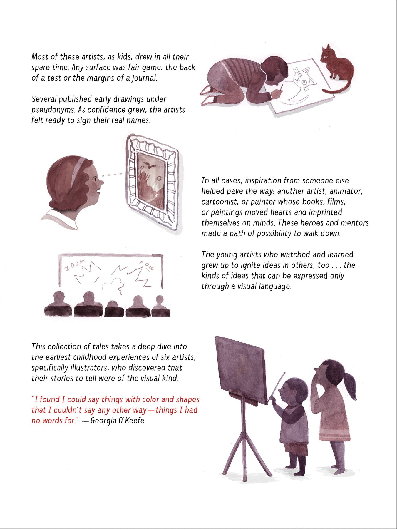 This vibrantly illustrated graphic novel anthology brings to life the childhood experiences of beloved artists and illustrators such as Wanda Gág, Maurice Sendak, and Jerry Pinkney. Stylish illustrations paired with small vignettes and anecdotes from the artists' early lives helps illuminate the hard work, triumphs, failures, and inspiration that helped forge their successful careers. What makes an artist? What sparks their imagination? Where do their creativity and unique style come from? Striking illustrations and a graphic novel format bring to life this anthology of legendary artists and their childhoods. Featuring beloved artists such as Wanda Gág, Maurice Sendak, Tove Jansson, Jerry Pinkney, Yuyi Morales and Hayao Miyazaki, these stories capture the childhood triumphs, failures, and inspirations that predated their careers.