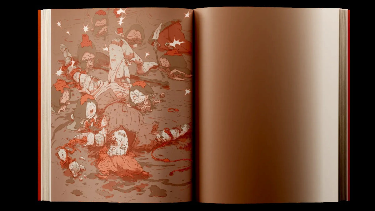 A hot wind whips across tattered banners and hollowed skulls on an ancient battlefield. In the distance, a broken stone fortress stands out against a pale orange moon. You slowly make your way up to the rubbled structure, moving slowly to avoid traps or hidden enemies. You are far from the small bonfire you came across hours ago, and your heart is racing. In the remains of a central courtyard, you find a strange tome. It’s covered in dust and blood from who knows what or where. Carefully, you pick up the book and wipe away the debris. You can barely make out the title in the sickly moonlight, but you see the words...