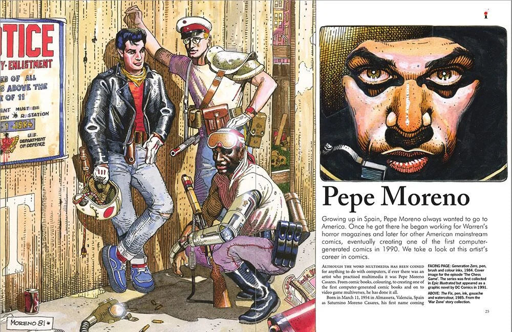 Then Pepe Moreno's post-apocalyptic visions of New York City: the punk, rebellion and war stories of the Spanish-born comic book artist, RPG designer and creator of one of the earliest digital comics! He also worked for the Warren horror magazines and simply showed up at their offices with a portfolio under his arm. He later worked for all the major comic publishers in the US and was the creator of one of the first computer-generated comics, Batman Digital Justice, which became the best-selling graphic novel of 1990.