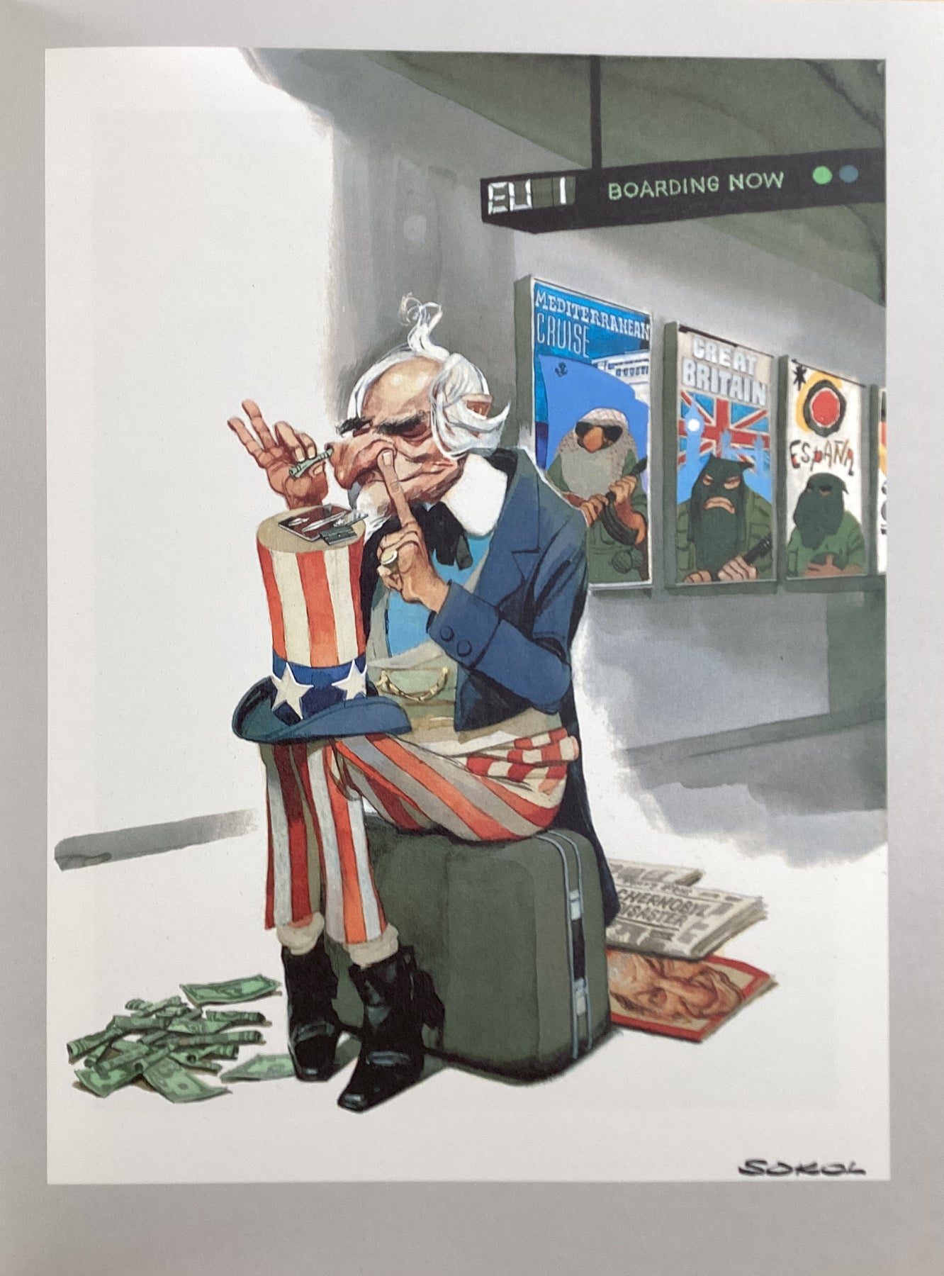 Erich Sokol (1933 - 2003) was an Austrian illustrator and caricaturist. Sokol is famous in American for his cartoons for Playboy magazine (from the late 1950s to 1975), however in his native Austria and Germany, his reputation was more like Mort Drucker or Jack Davis--a cartoonist and caricaturist of politicians and celebrities for magazine covers.