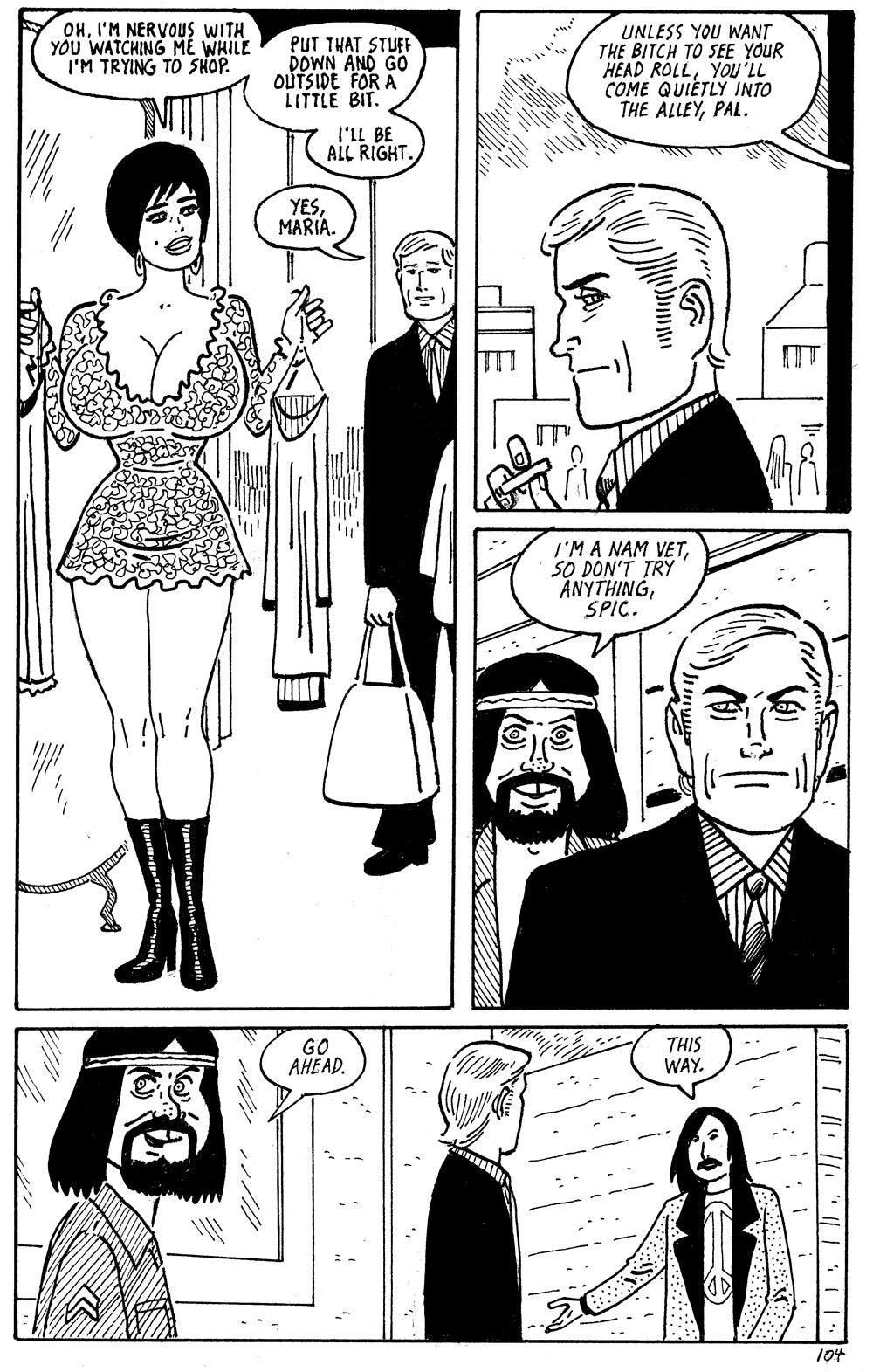 A woman comes to the U.S. from Latin America to escape her shady past, only to fall into a new shady life. After a go at the adult entertainment business, Maria marries a drug lord and her dangerous past is nothing compared to her new life in America. The drug lord's son, Gorgo, secretly falls in love with her and he watches over her like a guardian angel. Danger and corruption (and of course sex) drive the first half of this love story. Long-time Love and Rockets readers will find the storyline familiar... and that's because, in an Adaptation-style meta twist, Maria M. is actually the B-movie film adaptation of the life story of Lub's mother Maria, as previously seen in its real version in the classic graphic novel Poison River (available in the Beyond Palomar collection) starring Maria's own daughter playing her own mother. Confused? Don't be! Maria M. will work perfectly on its own terms as the kind of violent, sexy pulp tale that Gilbert Hernandez has proven so adept at these past several years, and the source material for the story will just provide an extra layer of delight for the cognoscenti. Part One.