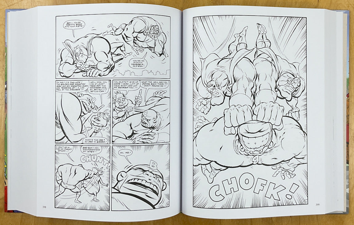 Don Simpson's classic superhero parody and worldbuilding multi-character epic, collected here in an omnibus volume almost as bulging as The Man Of Molecules' own muscles. All issues, sequels, spin-offs, one-shots and short stories from 1983 to 1990 are collected here, along with a plethora of unpublished art and roughs, unseen sequences, plot outlines, historic photographs, various rarities, and an extensive afterword by Simpson.