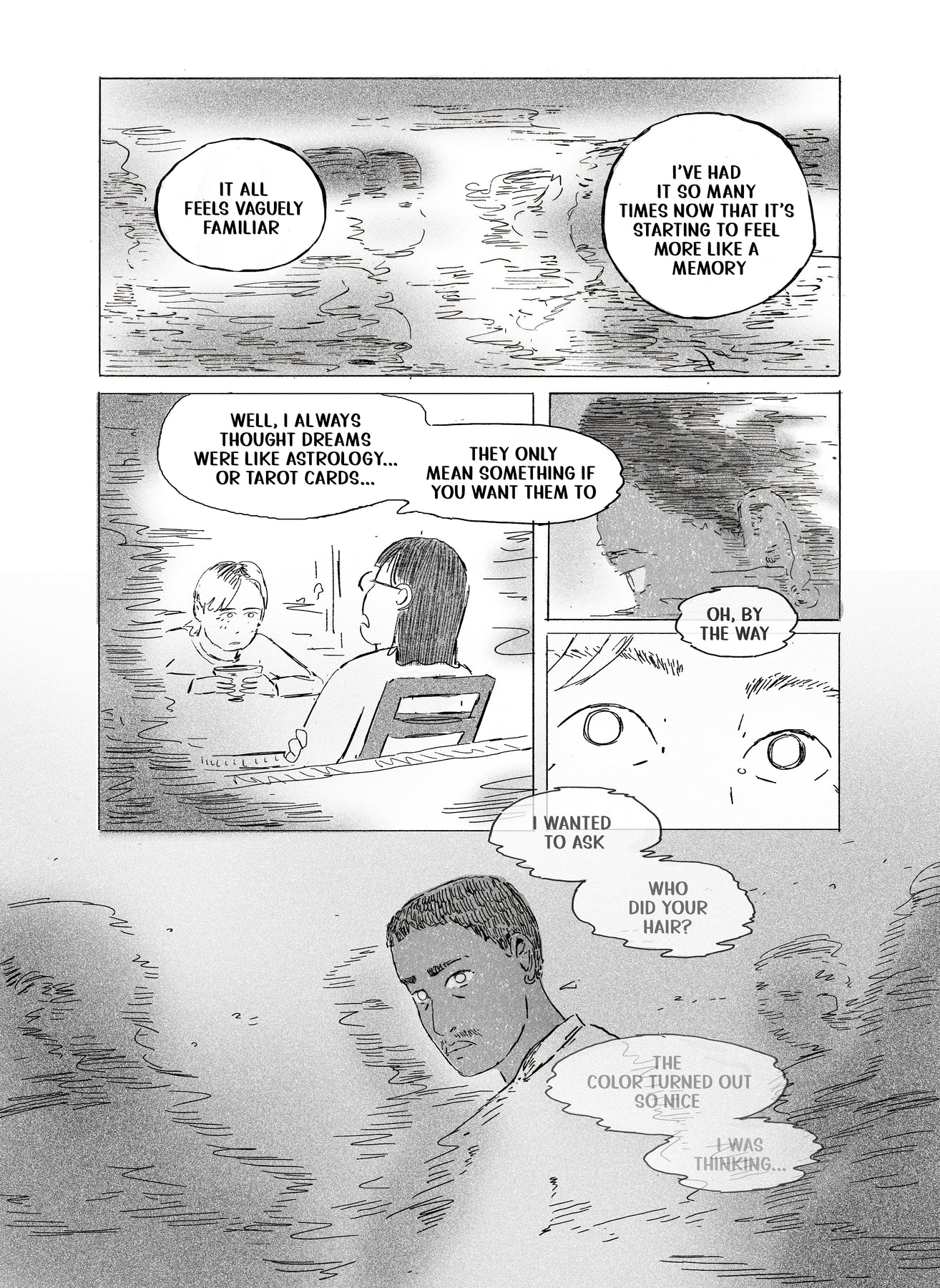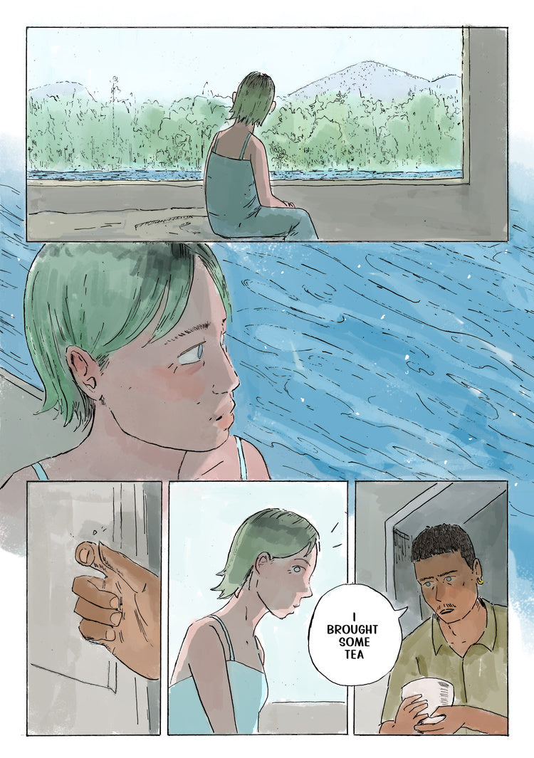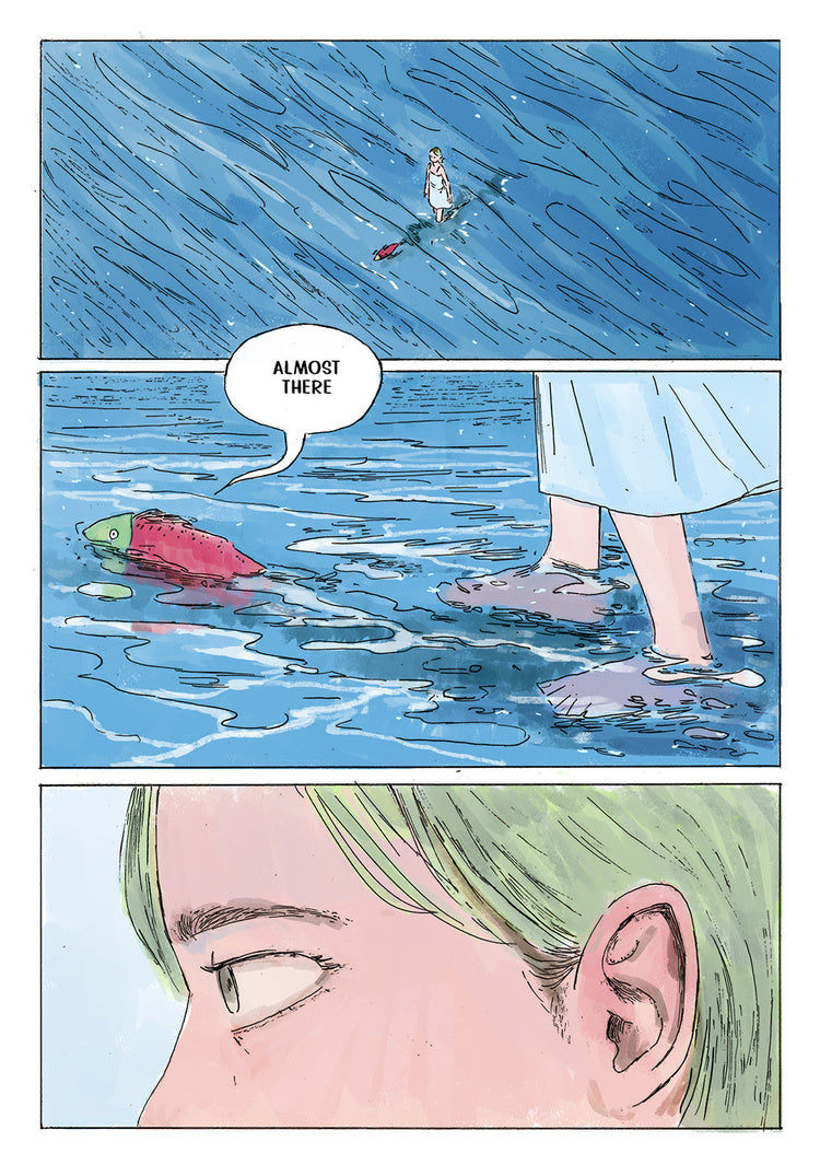 Under the rains of the Pacific Northwest, Aurora tries to find the origins of her recurring dreams, guided by a man she suspects to be a fish. A 56 page graphic novel. Signed by the artist with a small drawing.