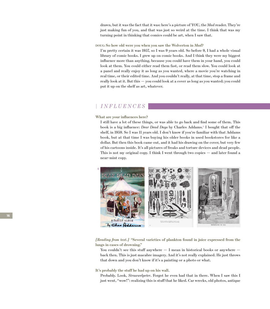 The book features work by a pantheon of cartooning masters, including Charles Addams, Carl Barks, Charles Burns, Al Capp, Dan Clowes, Jack Cole, R. Crumb, Jack Davis, Kim Deitch, Will Elder, Al Feldstein, Virgil Finlay, Drew Friedman, Chester Gould, Justin Green, Rick Griffin, Bill Griffith, Matt Groening, George Grosz, V.T. Hamlin, Jaime Hernandez, George Herriman, Al Hirshfeld, Graham Ingels, Bernard Krigstein, Harvey Kurtzman, Gary Panter, Virgil Partch, Savage Pencil, Peter Pontiac, Charles Rodrigues, Spain Rodriguez, Charles Schulz, Gilbert Shelton, Joost Swarte, Stanislav Szukalski, Irving Tripp, Chris Ware, S. Clay Wilson, Basil Wolverton, Wallace Wood, Jim Woodring, Art Young, and — it should go without saying — many more.