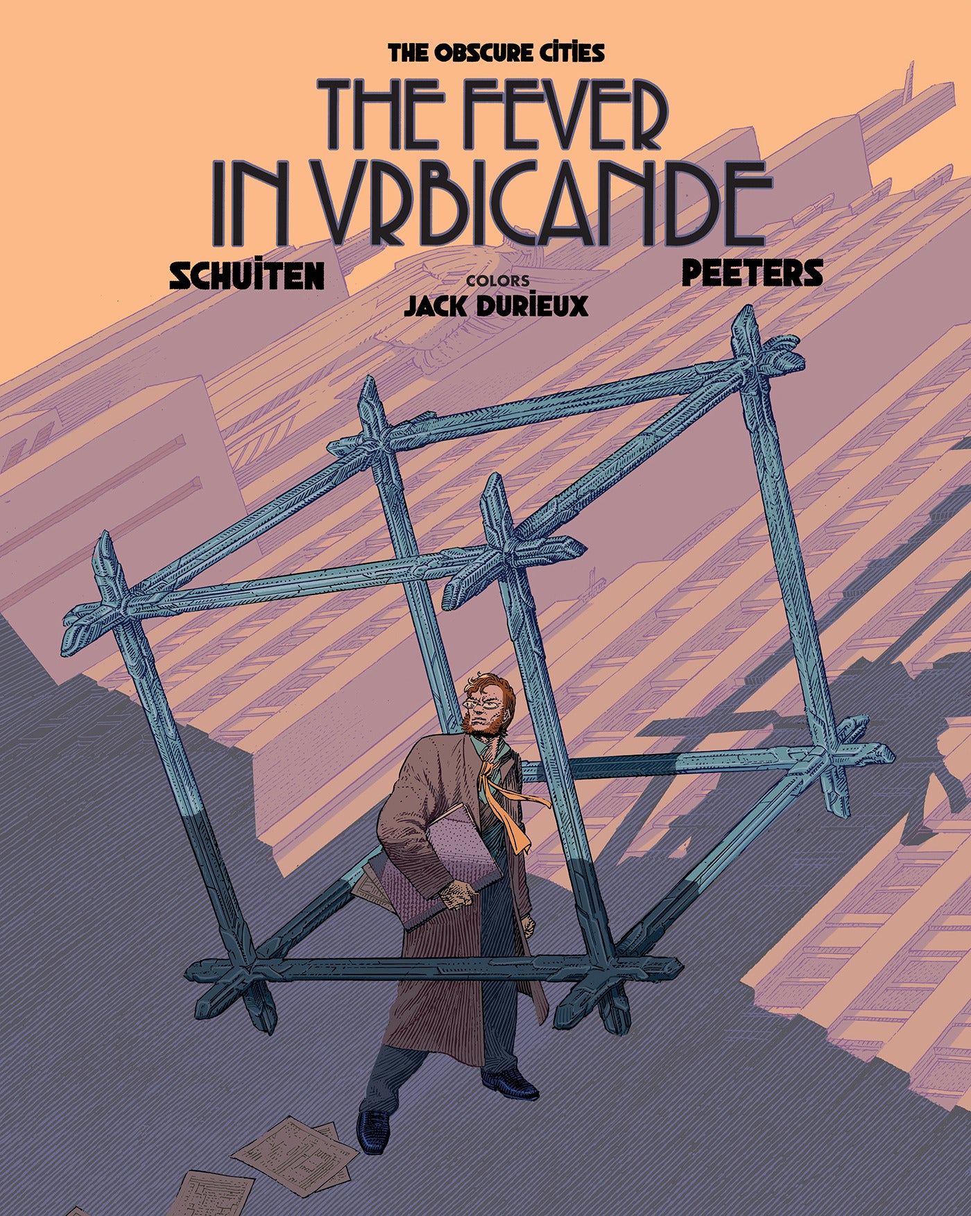 Visit a land full of mystery, ancient alchemy, and modern technologies in this award-winning graphic novel series, now in a new edition with all-new colors and an updated translation! The second book in the original The Obscure Cities series, The Fever in Urbicande was first published in English by NBM in 1990 in black-and-white. This updated edition features an all-new translation and beautiful new coloring supervised by Francois Schuiten and Benoit Peeters. Eugen Robick, Urbatect of Urbicande has been designing a new bridge to connect the southern portion of the city to the north, but his bid to commence construction has been denied by the Commission. Unconcerned with the politics of the situation, Eugen only cares about the balance it will bring to the city. While contemplating how he can convince the Commission to see things his way, Eugen is brought a cube made of beams discovered during construction of another project. Initially small enough to fit on his desk, it begins to grow, adding beam after beam, until it soon takes over his entire office. Growing exponentially, it eventually takes over the entire city, disrupting the social order as citizens begin using the beams to travel back and forth between the southern and northern parts of the city, previously only accessible via the guarded bridges. While the Commission wishes to put a stop to any such social change, the cube's impact is overpowering and irreversible.