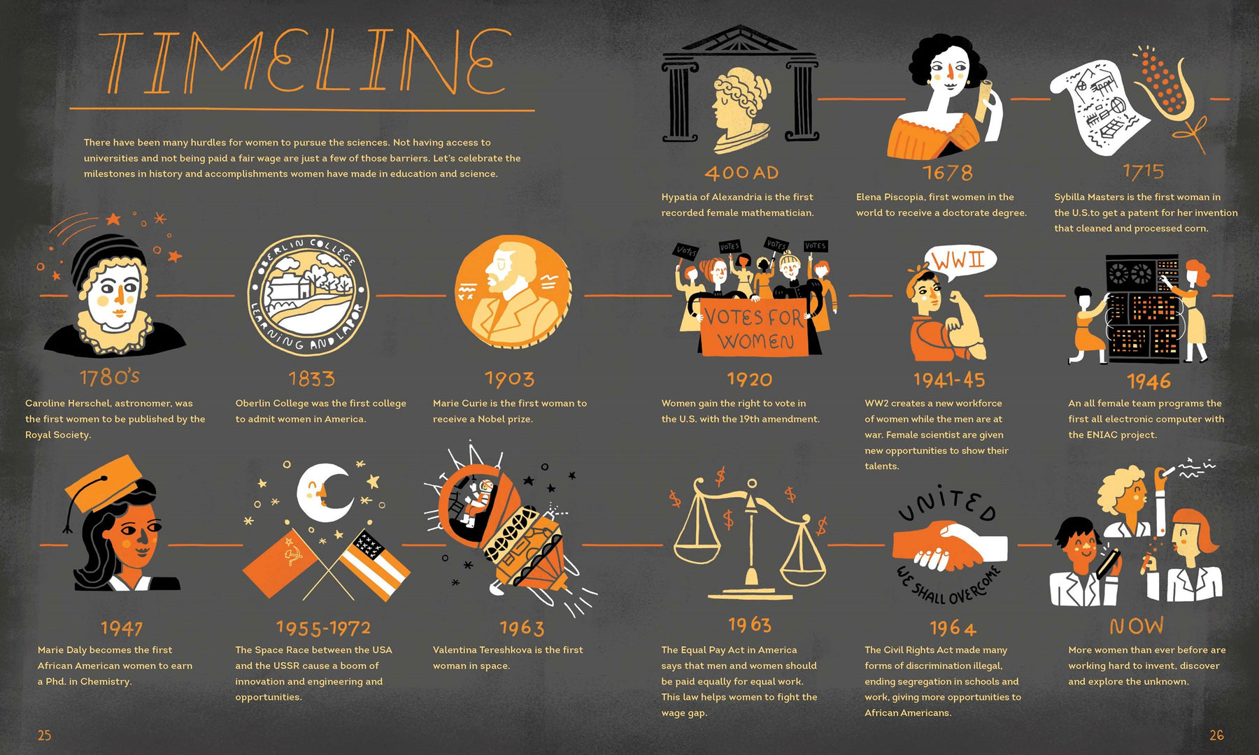 Women in Science celebrates the achievements of the intrepid women who have paved the way for the next generation of female engineers, biologists, mathematicians, doctors, astronauts, physicists, and more!