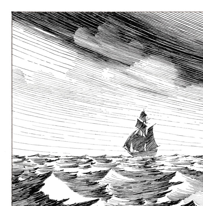 The bitter cold and desolate landscape echoing his deep isolation, perfectly captured by Bernie's masterful ink work.