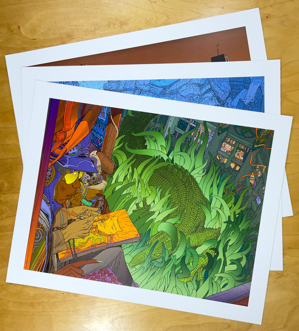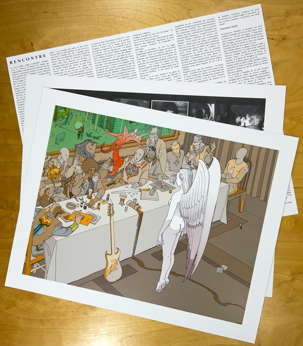 Thirteen 15-1/2" x 19-1/2" prints--a cover sheet, numbered and signed by Moebius and Coghe; ten color Moebius illustrations; a simulated contact sheet of photographs by Coghe; and Coghe's text, in French--housed in a custom portfolio box with an illustrated lid.