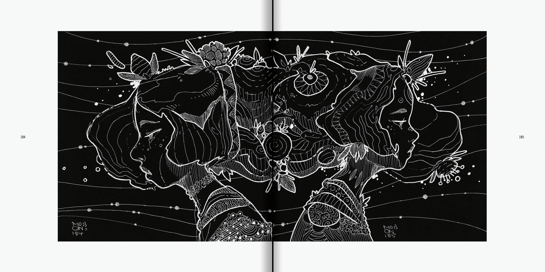 Entering Moon's universe is to let oneself be taken by the hand to discover a world full of vibrant colours, creatures simultaneously both human and vegetable, and discovering the balance between form and nuance. The maxim that a picture is worth a thousand words, were never truer than when in reference to Moon's drawings, which reveal torment, expectation, encounters, doubt... Life in its widest and most vivid emotional range.