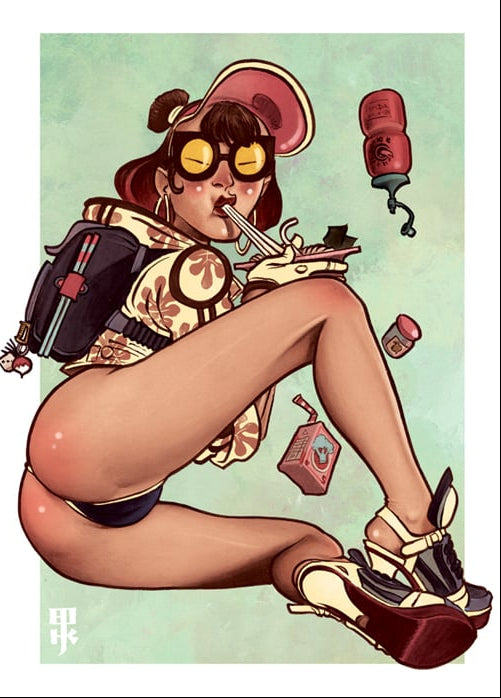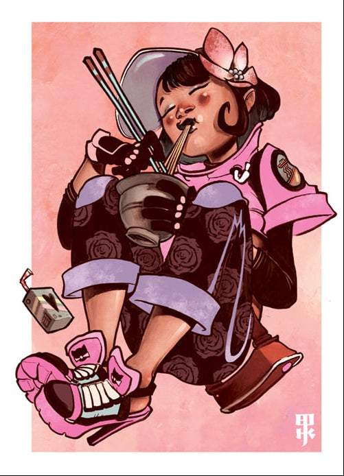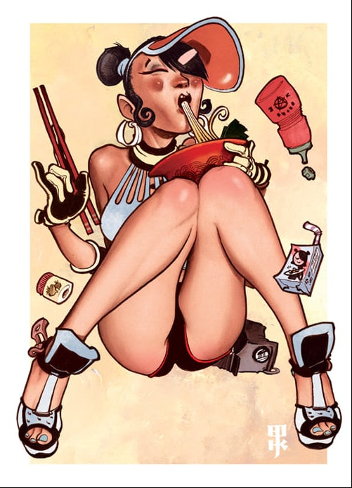 A set of 6 OMNOM floating noodle girls by Electric Pick (EPHK) as high-quality A5 (15 x 21cm) size offset prints printed on rich uncoated paper.