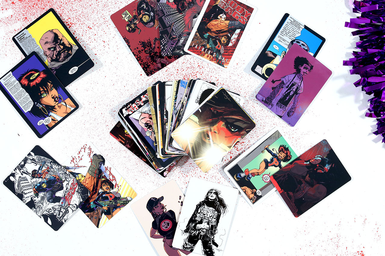 A Trading Card Set (50-cards. 2.5" x 3.5") featuring images from Jason's Pearson's Body Bags comic book series.