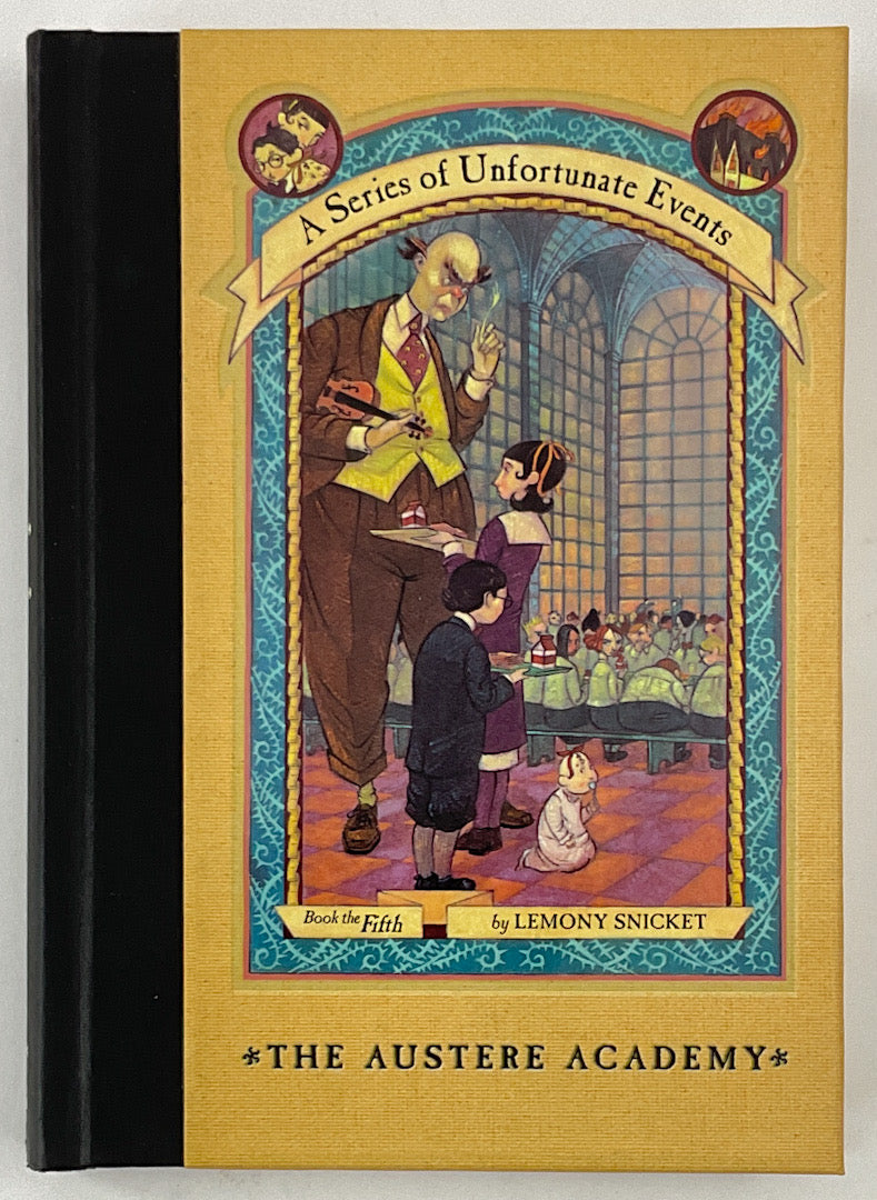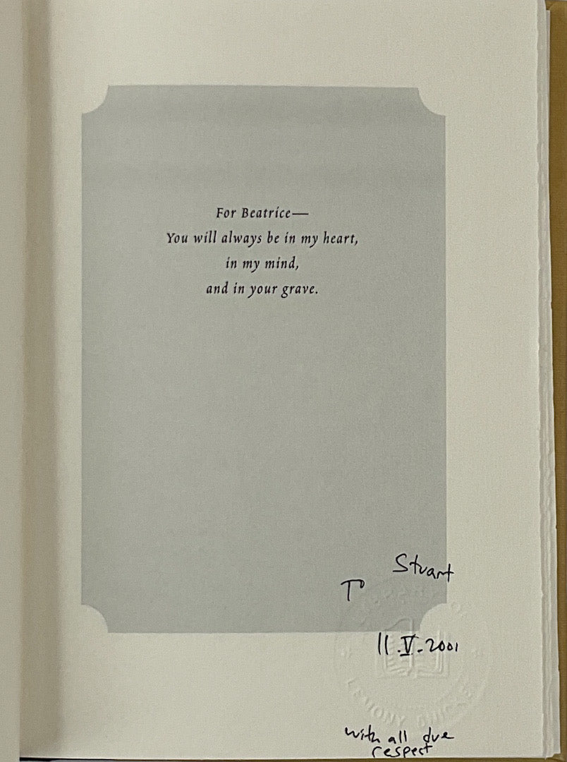 As was the author's custom, he has embossed this copy with the his "Library of Lemony Snicket" blindstamp and he has written "With all due respect" and the date II.V.2001. He has inscribed this "To Stuart"