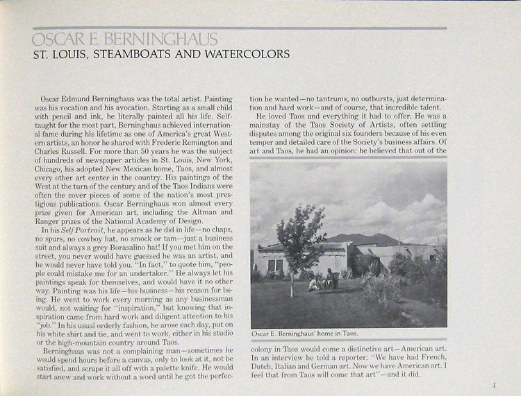 "Berninghaus was one of the original six founders of the famous “Taos Society of Artists” and worked in Taos during summer months and in St. Louis, Missouri during winter months until 1925 when he made Taos his permanent home.