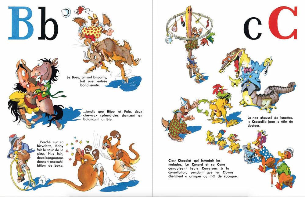 In 1946, then at the height of his talent, Calvo signed Mr Loyal Presents..., a magnificent primer for children with bright colors and incredibly supple lines. Joyful circus animals overflowing with vitality perform their routines to the delight of readers, young and old. This particularly neat reissue is a facsimile made from the original drawings, except for three pages reproduced from the period edition.
