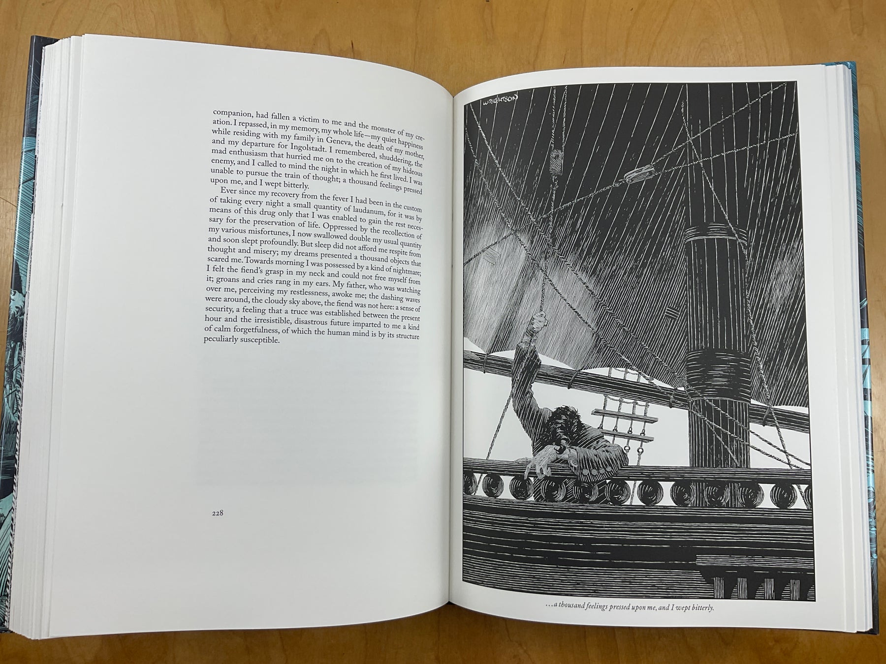But as the story teaches, maybe it’s just as well that creative origins remain a mystery. This is an elemental novel. It begins and ends in ice, and in between are moments of fire. But whatever descriptive fireworks the text may lack were ignited onto the page in 1983 when Bernie Wrightson’s imagination and technical skill gave the creature new life. Wrightson’s illustrations are more than interpretative, they are faithful to both the tale and it’s influences. They illuminate another dimension of depth. The drawings in this edition are integrated with the spirit of the novel in a way that makes it seem as if they were always there, buried, waiting to be dug up, waiting to re-awaken the horror 19th-century readers must have envisioned when reading this book for the very first time.