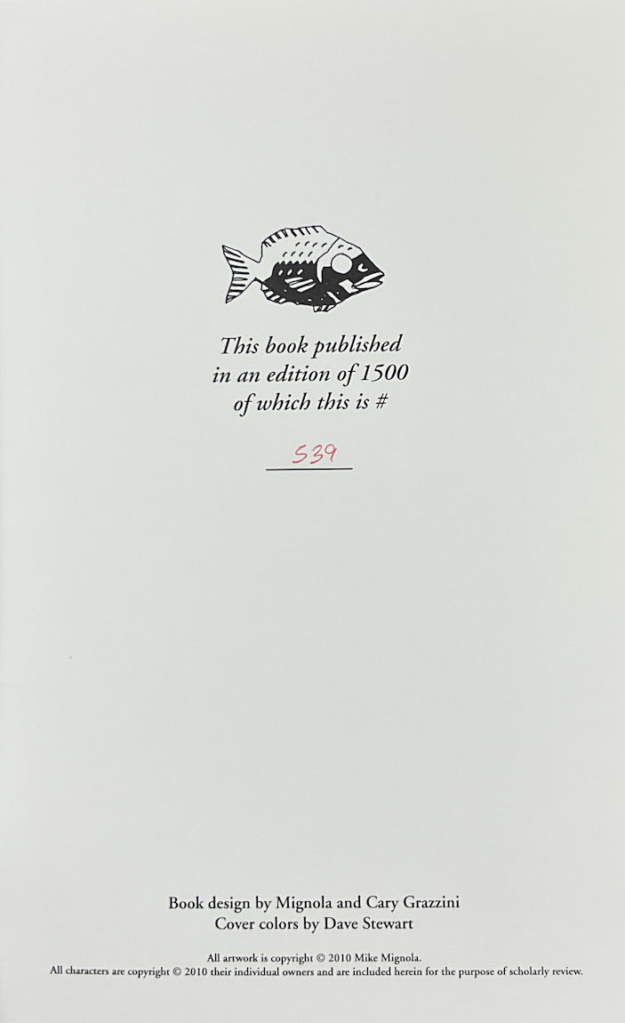 Mignola's self-published chapbook for 2010 reprints covers, pin-ups and illustrations, many from obscure sources. full-page pen and ink drawings exquisitely reproduced on heavy stock. Eleven Hellboy pieces, BPRD, Baltimore, a Sock Monkey tribute, and other wonderful gothic images.