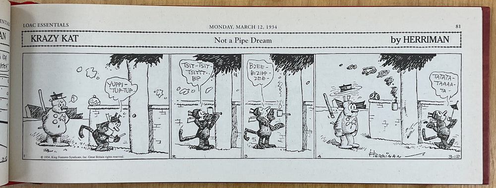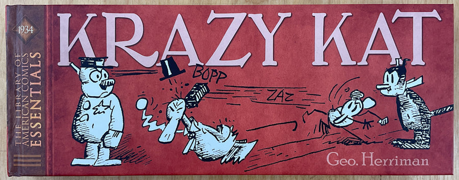 The 1934 strips reprinted in this book fit anyone's definition of "essential." They show Krazy Kat at top speed, ever-changing, endlessly inventive, with language that sparkles with double meanings and more in lines such as "his malady drills me to my sole."