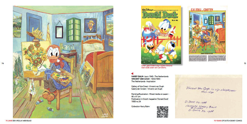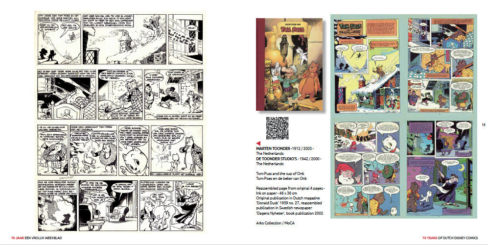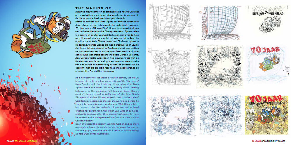 A richly illustrated catalogue has been compiled for the third exhibition at MoCA, '70 Years of Vrolijke Weekblad Donald Duck" (Happy Donald Duck Weekly). This unique catalog is being published in a limited edition of 750 copies . This deluxe hardcover edition contains 166 color pages. The deluxe hardcover edition, sewn bound – 210 x 210 mm – contains 166 color pages with illustrations of over 50 originals on display and extensive information on the more than 30 cartoonists. It also includes an overview of the developments over the past 70 years of Vrolijke Weekblad Donald Duck (Happy Donald Duck Weekly). Renowned cartoonist Daan Jippes created a beautiful cover illustration especially for MoCA, featuring all the familiar Donald Duck characters. Gerben Valkema , Cartoonist of the Year , colored the illustration. Editor-in-chief and avid Donald Duck fan, Ferdi Felderhof , wrote a captivating and cheerful foreword to this catalog. The book includes a small art print of the cover.