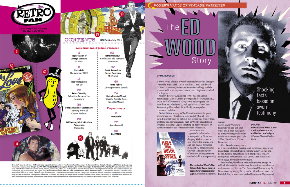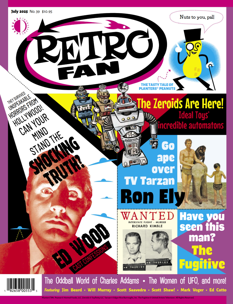 Plus: Zeroids, TV Tarzan Ron Ely, Planters Peanuts, Charles Addams, TV's The Fugitive, the Women of UFO, a romance columnist tells all, and more! Featuring columns by Jim Beard, Will Murray, Scott Saavedra, Scott Shaw, and Mark Voger. Edited by Ed Catto.