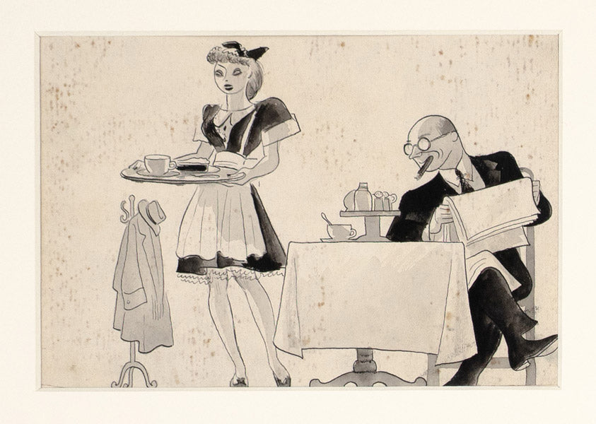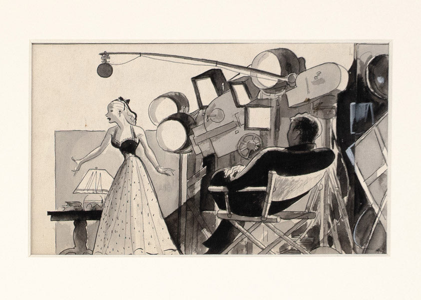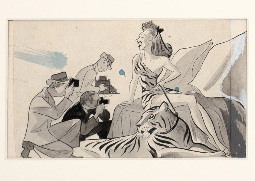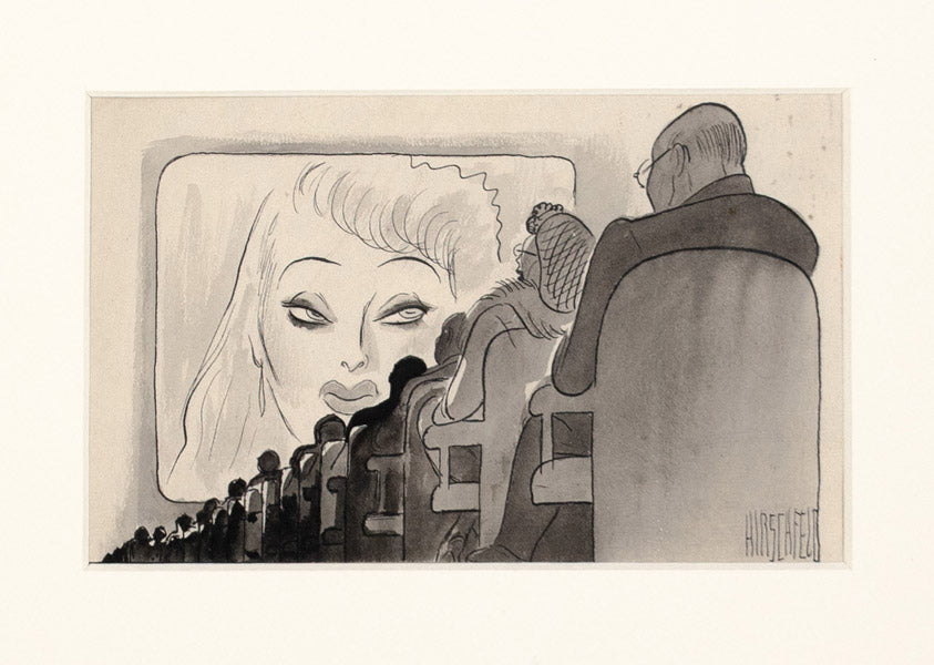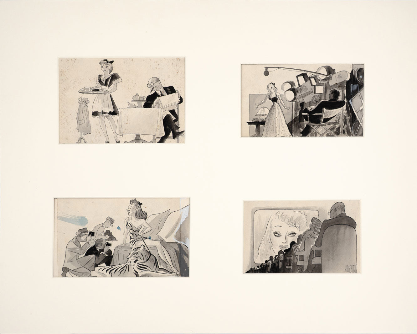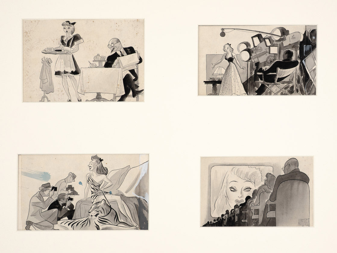 An incredible four panel cartoon. Hirschfeld seldom created sequential comic art. Here is one of two examples in our exhibition.